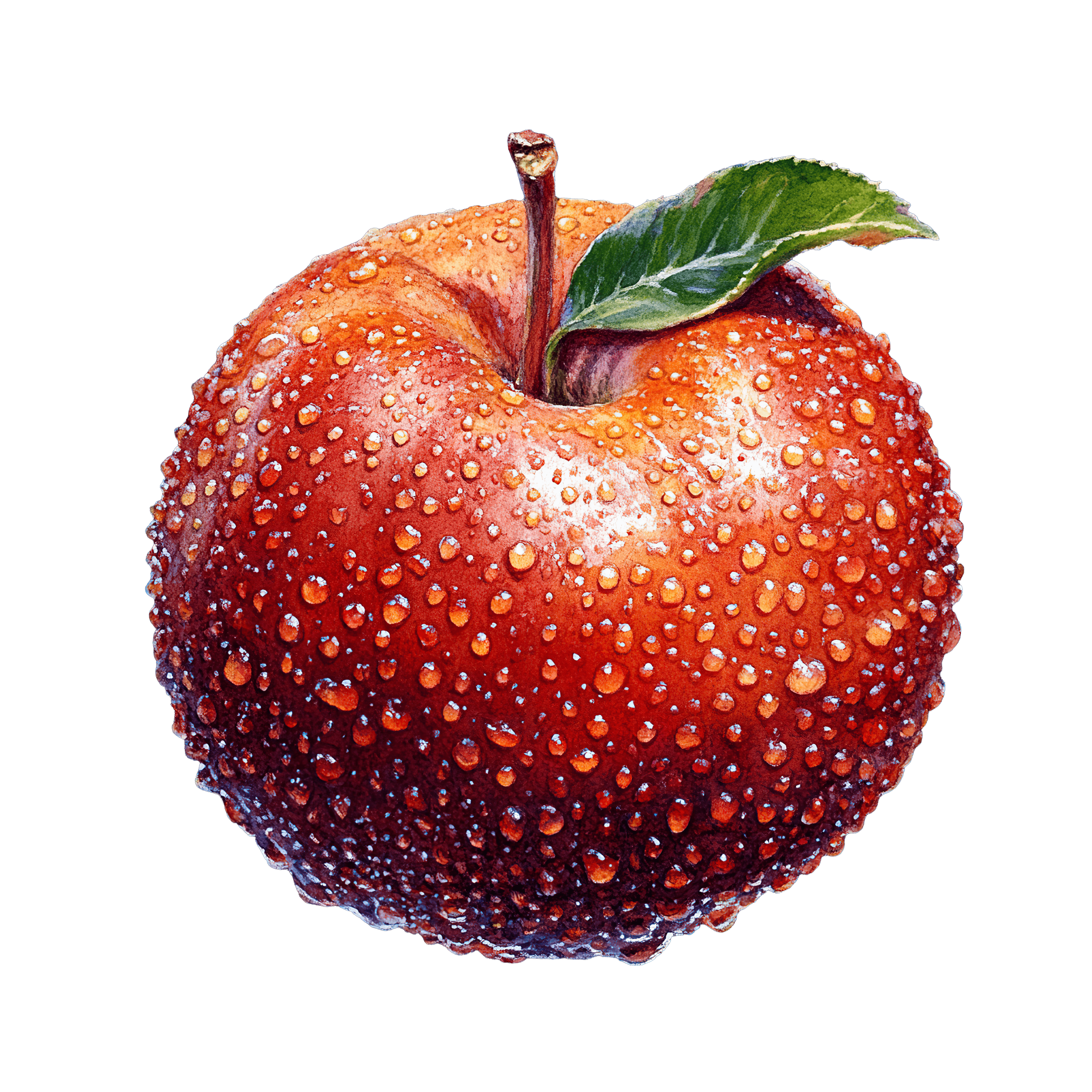 Red Apple with Water Droplets and Green Leaf Red apple covered in water droplets with a single green leaf.Download PNG ▼Download JPG ▼Related posts:Slice of Apple Strudel with Powdered Sugar ToppingCherry Tart with Whipped Cream and Mint GarnishPeanut Butter Cookie Clipart with Textured SurfaceColorful cartoon giraffe blowing bubbles clipartFestive Christmas Star Ornament with Red and Green DetailsWatercolor Passion Fruit with Leaves and Halved ViewRed Leaf with Detailed Veins and Natural TextureYellow Watermelon Slice with SeedsWatercolor Illustration of Green Palm Leaf on Black BackgroundYellow Banana with Detailed Texture and Green StemRed Christmas Ornament with Gold Decorative Pattern DesignStack of Colorful Books with Polka Dot Covers
