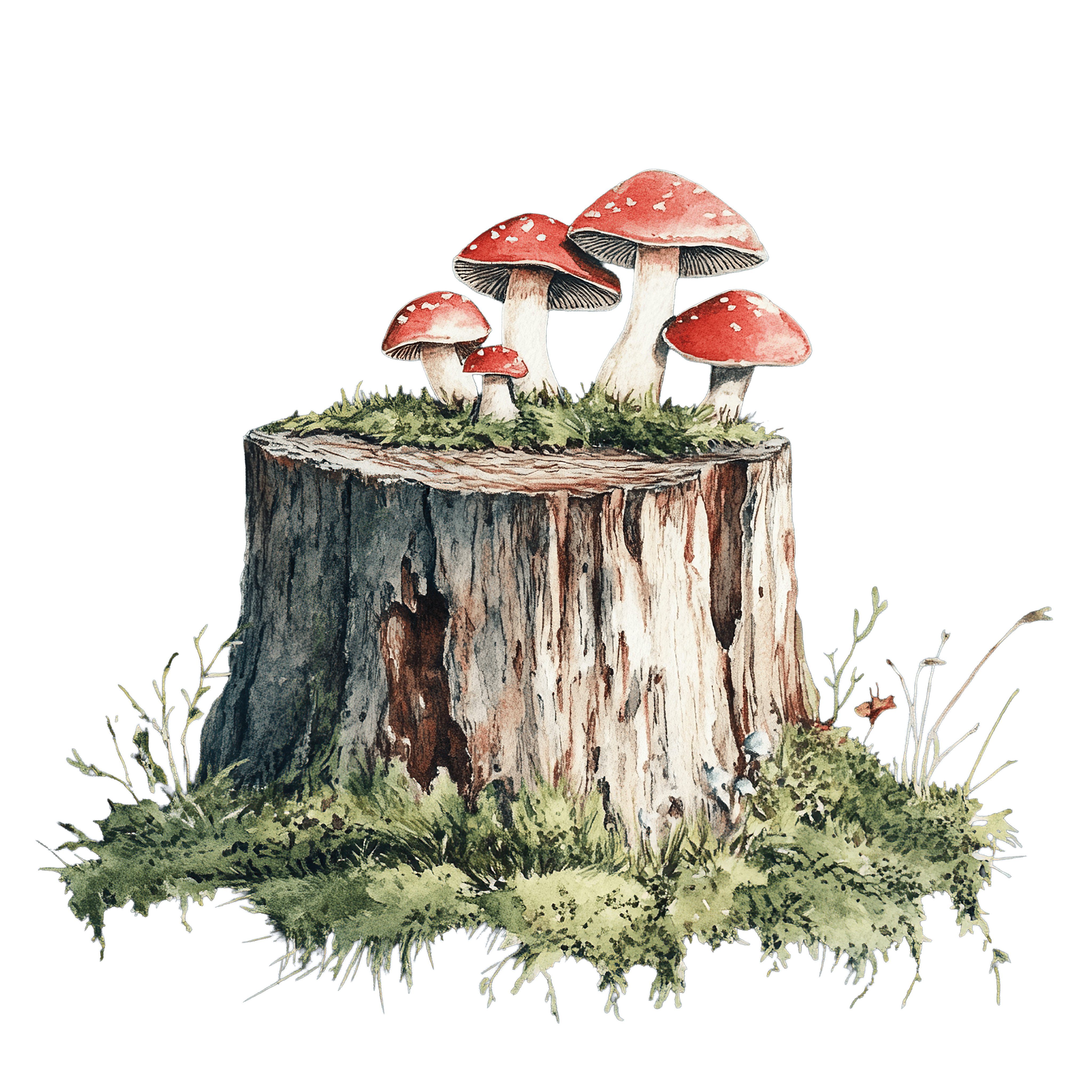 Red Mushrooms Growing on a Tree Stump in Detailed Illustration Red toadstools grow atop a tree stump amidst grass and moss.Download PNG ▼Download JPG ▼Related posts:Two Green Pea Pods with Detailed Texture on BlackWatercolor Fruit Collection Featuring Citrus and Berries on BlackRed Berry Branch with Green Leaves and Water DropletsMice in Santa Hats with Christmas Gift Boxes and TreatsDetailed Illustration Of A Brown And Orange ButterflyTraditional Christmas Pudding with Holly and Berries DecorationFresh Green Onions with White Bulbs in a BunchWatercolor Coconut Drink with Straw and Orange SliceWatercolor Cappuccino Cup with Heart-Shaped Foam Art holiday coffee drink saucer heartWoman Wearing Santa Hat and Scarf for Christmas SeasonBlack and White Lamb Clipart IllustrationWatercolor Eggplant with Detailed Purple Texture vegetable clipart food green stem vector