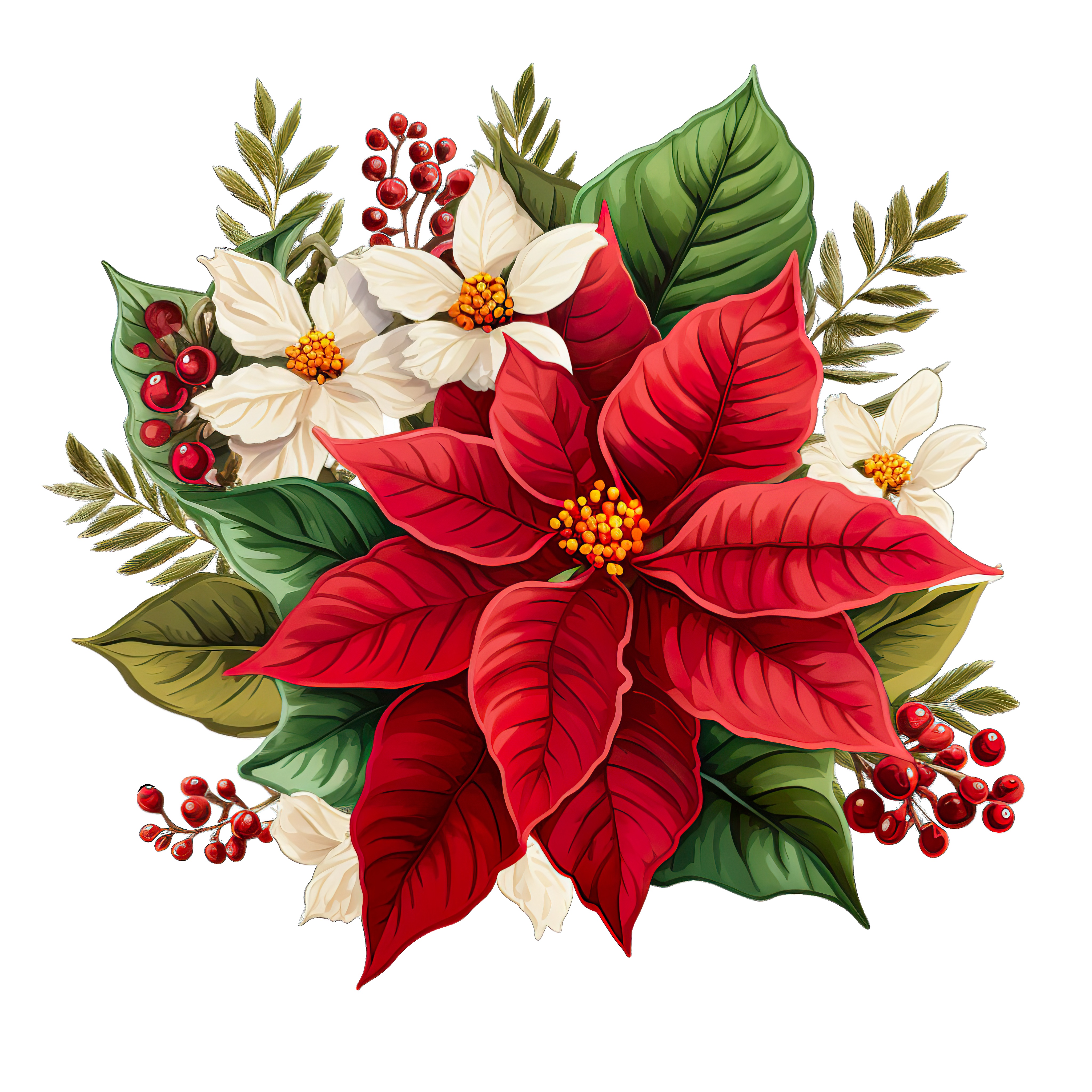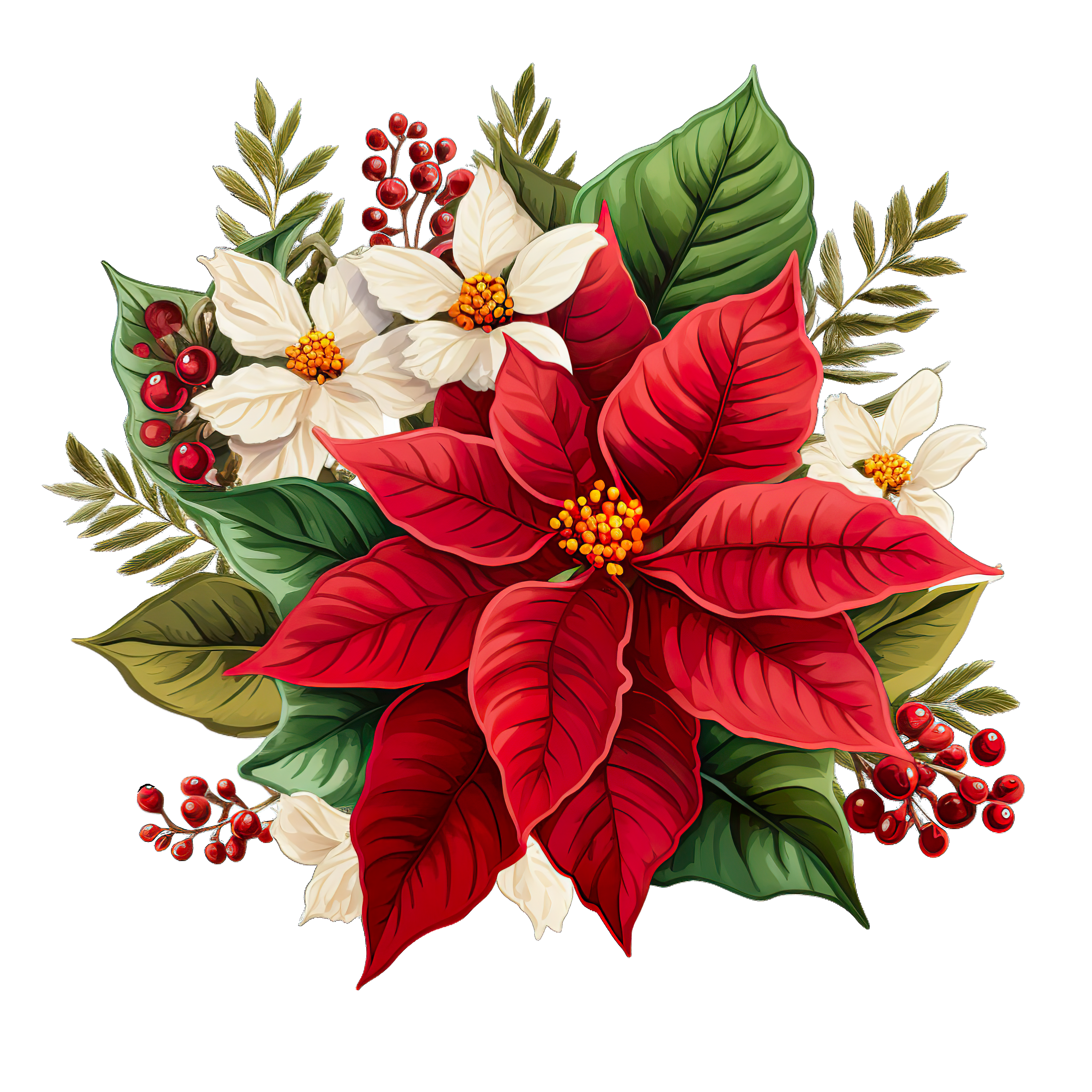 Red Poinsettia with Green Leaves and White Flowers Illustration Bright red poinsettia with green leaves and white flowers and berries.Download PNG ▼Download JPG ▼Related posts:Watercolor Red Leaf Branch Foliage Vector ClipartDetailed Illustration Of A Vibrant Butterfly With ColorfulPink Sea Anemone with Flowing Tentacles in Vector ArtSparkling Christmas Ornament with Glittering Star PatternsSanta Claus with Pinecones and Holly Christmas IllustrationCartoon White Bird with Yellow Beak ClipartColorful Butterfly with Flowers in Vibrant Clipart StyleWoman in Historical Red Outfit with Festive AccessoriesChocolate Chip Cookie with Crispy Texture and Rich FlavorWatercolor Orange with Green Leaves on Branch fruit clipart vector art citrusBlue-green succulent plant with rosette shape and pointed leavesDelicious Chocolate Brownie with Cracked Top
