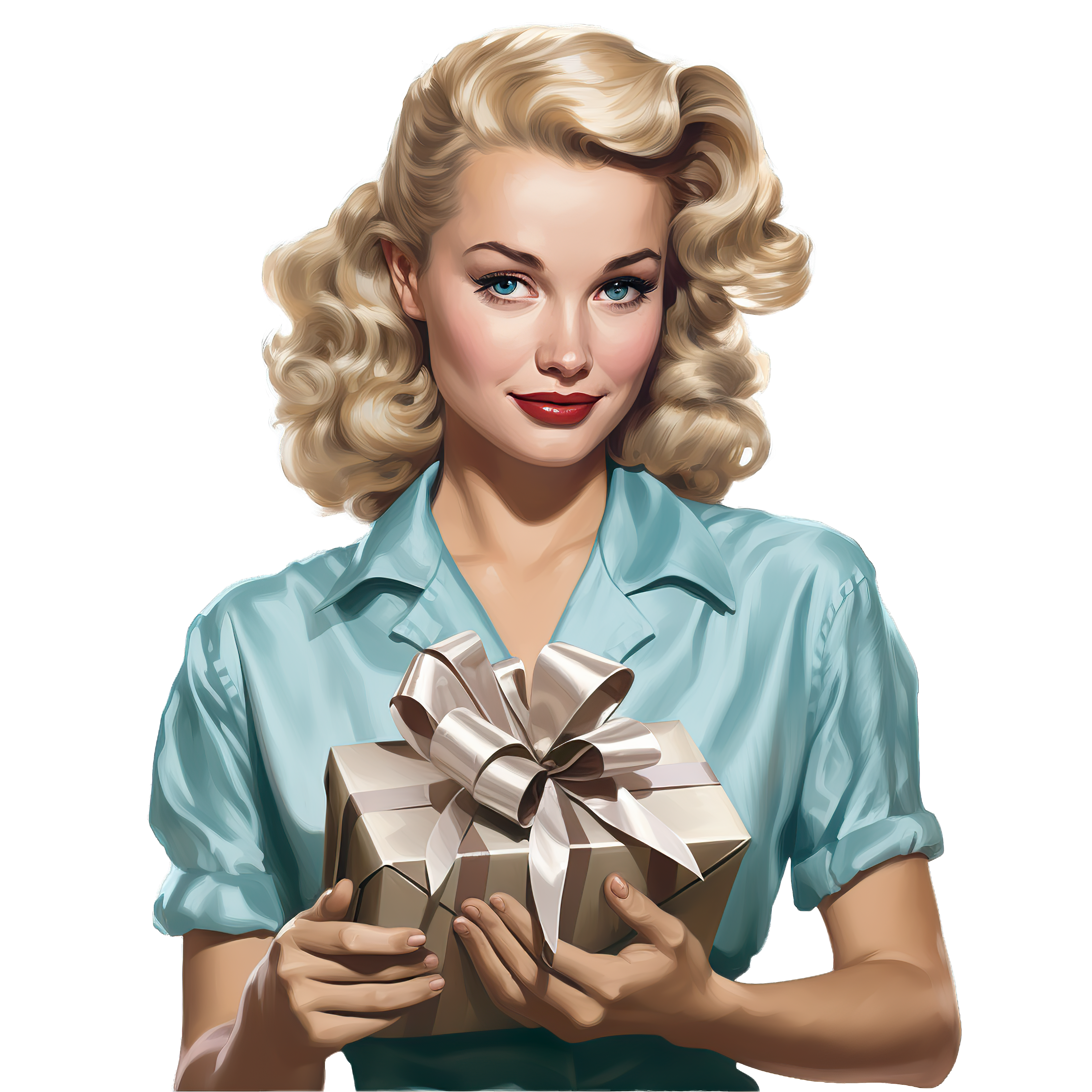 Retro Woman Holding Gift Wrapped with a Large Bow Blonde woman in vintage clothing holding a wrapped gift with a bow.Download PNG ▼Download JPG ▼Related posts:Detailed Butterfly Illustration With Pink And Black PatternedWatercolor Christmas Snowflake with Green and Red LeavesRefreshing Mint and Lemon Iced Tea Clipart IconDetailed Illustration Of A Blue And Yellow ButterflyPurple Butterfly With Glowing Heart Patterns On WingsRed Mittens with White Snowflakes and Falling Snowflakes IllustrationDetailed Yellow Sunflower Illustration with Green Leaves on BlackGift Box with Large Golden Bow and Sparkling DesignChocolate brownie square topped with pecan nuts dessert food sweet baked treatVictorian Style Woman in Red with Festive Hat and DecorationsCartoon cow playing with soccer ball illustrationPurple And Gold Butterfly With Detailed Wing Patterns