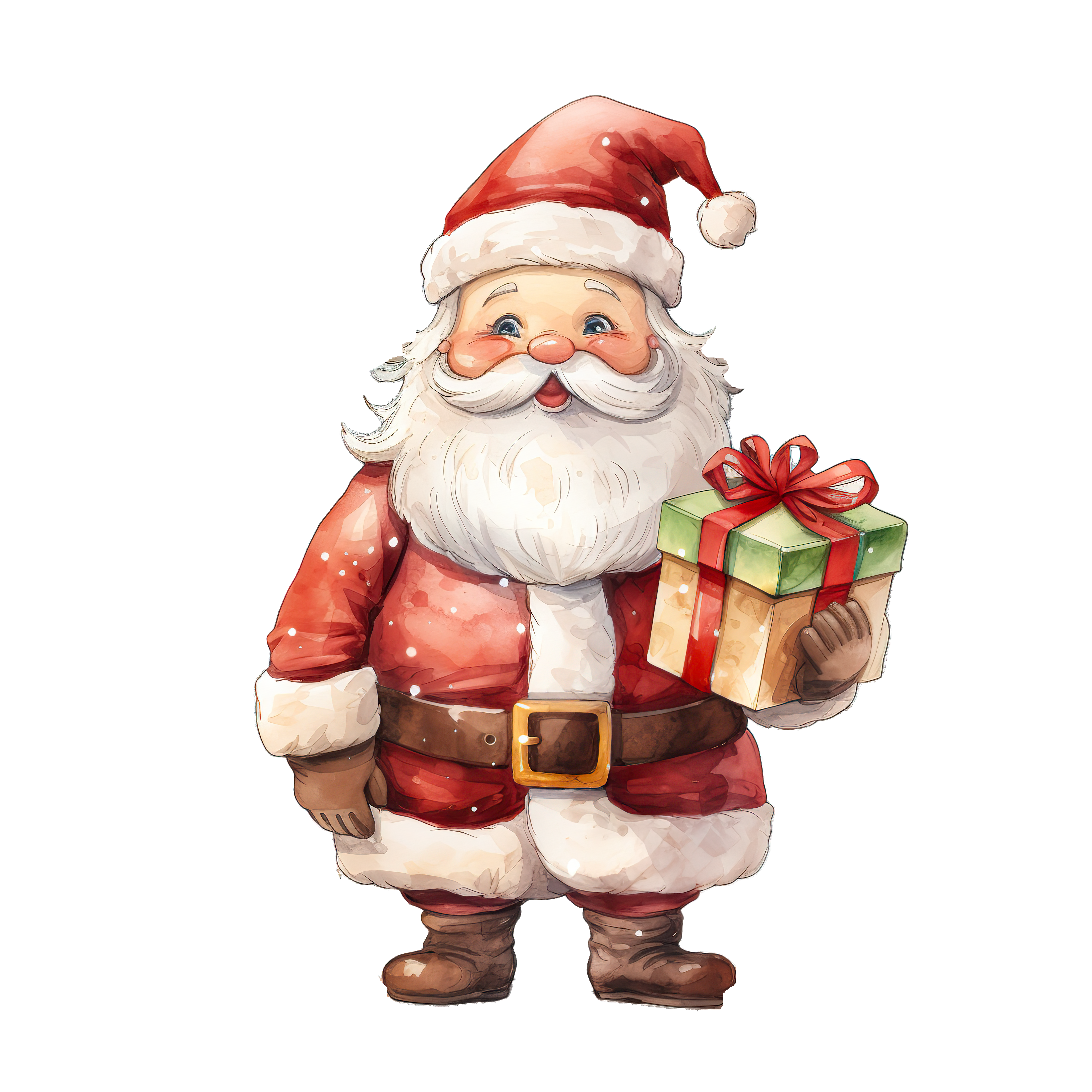 Santa Claus Holding Gift Box in Red and White Outfit Santa Claus in classic red suit holding a gift with a red bow.Download PNG ▼Download JPG ▼Related posts:Two Red Poppies with Silver-Green Leaves on Black BackgroundHand-drawn snail with detailed spiral shell designYellow Cauliflower with Green Leaves in Detailed ClipartFresh Broccoli Rabe with Green Leaves and StemsHedgehog Holding Apple Cartoon Vector IllustrationFresh Green Onions with White Bulbs in a BunchColorful Butterfly Illustration With Bright Orange And YellowRed Christmas Candles with Holly and Decorative BowWatercolor Branch of Red Hawthorn Berries with LeavesCartoon llama with Santa hat illustrationWatercolor Bonsai Tree in Ceramic Pot with Full Green LeavesBlue Watercolor Plastic Water Bottle Design