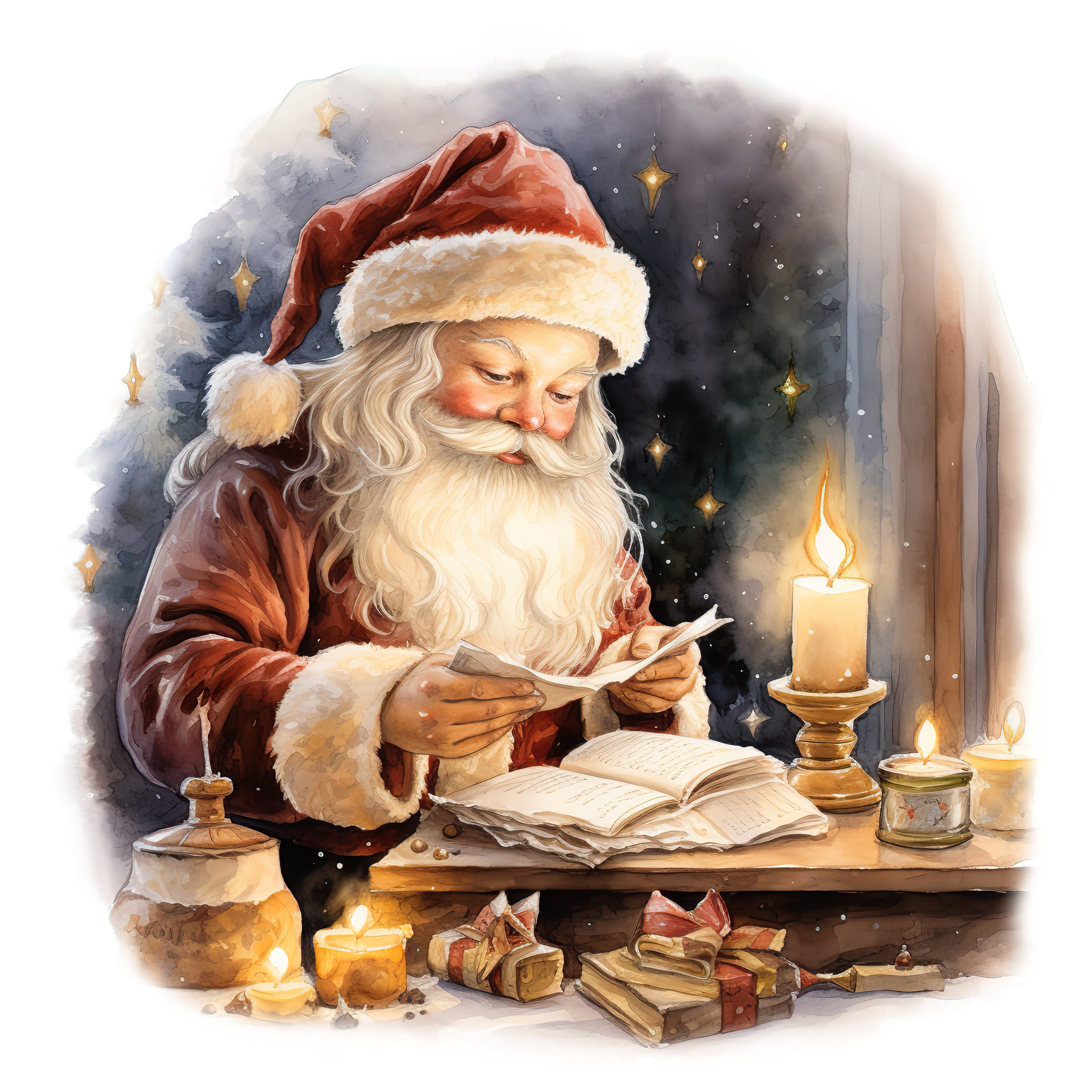 Santa Claus Reading Christmas Letter by Candlelight Santa Claus in red suit reading a letter with candles on a table.Download PNG ▼Download JPG ▼Related posts:Detailed Green Lettuce Leaves Texture DesignVibrant Red Hibiscus Flower with Green Leaves on BlackOatmeal Cookie Featuring Visible OatsVibrant Orange Nasturtium Flowers with Large Green Leaves IllustrationWhole and Sliced Lemon with Detailed Texture citrus fruit yellow clipart vectorHerbal Tea with Lemon, Ginger, and Mint LeavesGolden Brown Croissant Ring with Glossy Finish pastry bread shiny baked foodBlack Sheep Clipart with Curly WoolGlass of Apple Juice with Fresh Fruits and LeavesVibrant Watercolor Grapes and Green Leaves DesignWatercolor parsley sprigs with detailed green leaves on blackBunch of Purple Grapes with Detailed Highlights fruit clipart vector art food