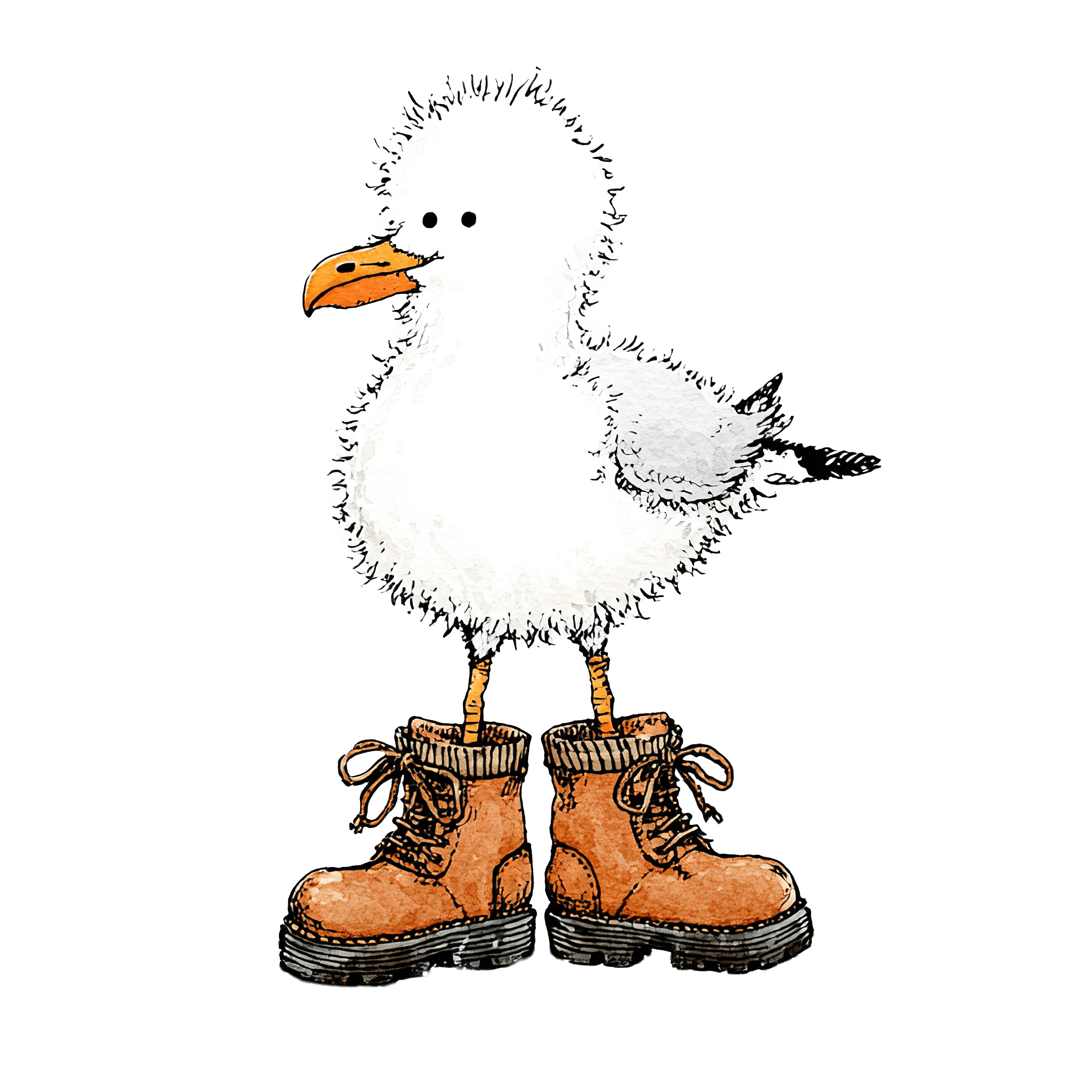 Seagull standing with orange beak and white fluffy feathers, uniquely wearing brown boots. Stylized in a hand-drawn manner, showcasing fine details in the feathers and footwear. A whimsical twist on a common bird often associated with shorelines. The focus is on the unusual addition of boots, creating an interesting and engaging visual element. Suitable for creative projects needing a touch of humor or originality.