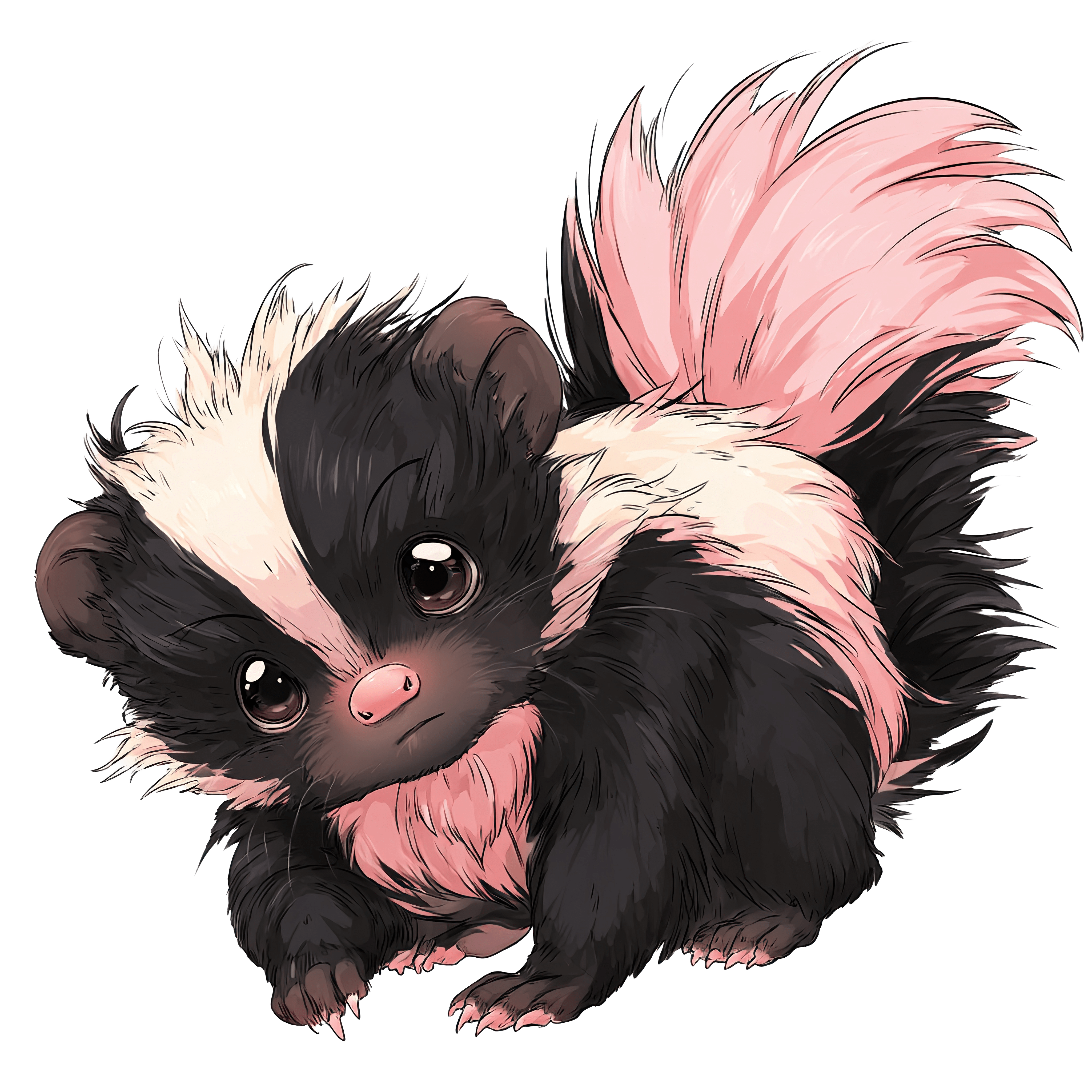 Skunk illustration featuring distinctive black and white fur with unique pink highlights on its tail and body. The animal is depicted with detailed, realistic features and a soft texture. Its posture suggests a lifelike quality, typical of skunk illustrations used in art and design projects. Ideal for educational materials, wildlife themes, and artistic collections.
