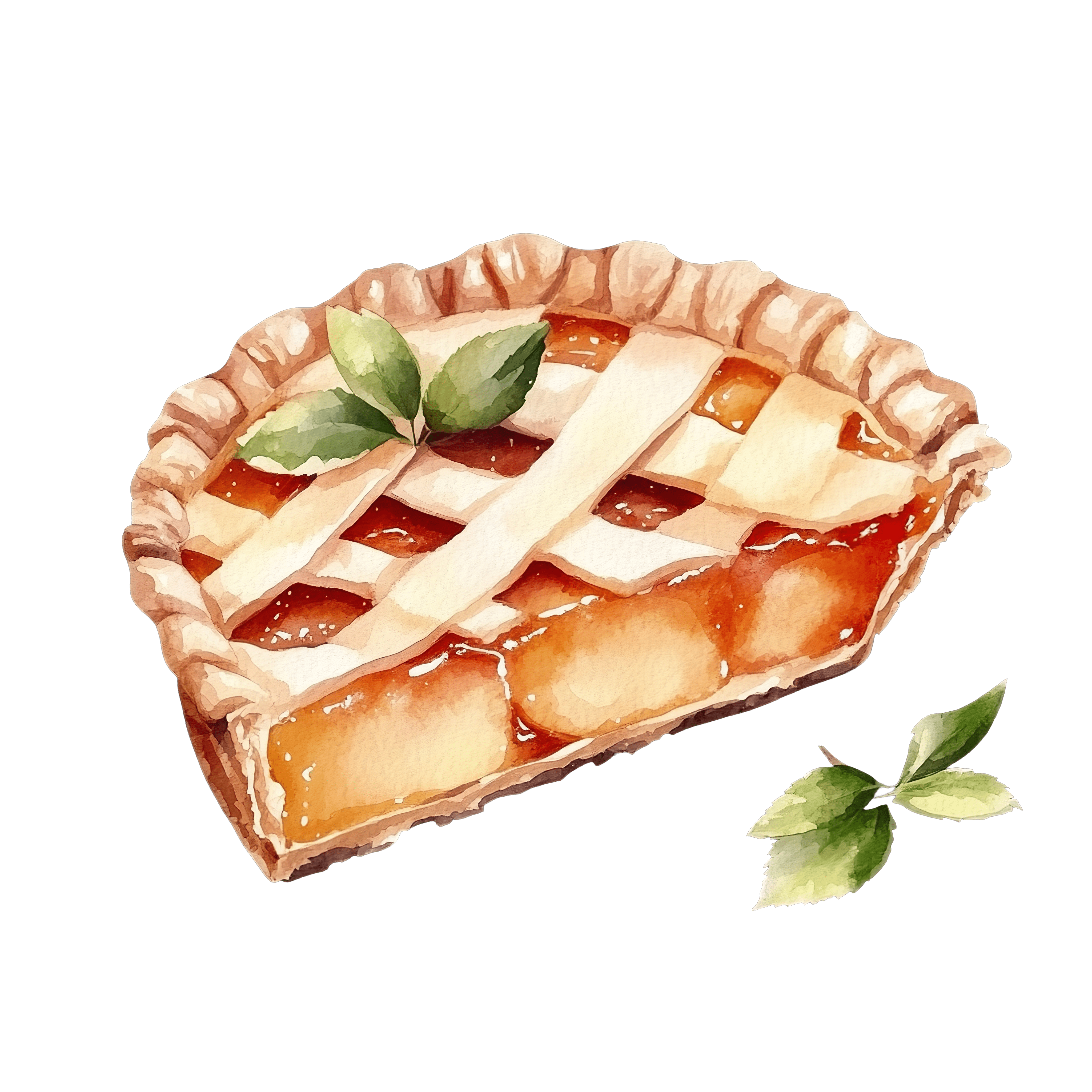 Slice of Apple Pie with Lattice Crust and Leaves Slice of apple pie featuring a lattice crust and green leaves.Download PNG ▼Download JPG ▼Related posts:Stack of Three Colorful Wrapped Gifts with Elegant RibbonsLemon Drizzle Cake with Icing and Lemon SlicesRed and White Striped Christmas Ornament with Swirled DesignRed Wine Glass with Rich Burgundy Hue drink beverage clipart vector artDetailed Clipart of a Half Papaya with SeedsGreen Bamboo Stalks Tied Together with Leaves bundle clipart vector art printableIced Tea with Lime and Mint Garnish beverage drink glass ice cubesWatercolor Red Leaf Branch Foliage Vector ClipartDetailed Green Butterfly Wings With Intricate PatternsPotted Bonsai Tree with Lush Green Foliage in Detailed IllustrationPassionfruit Panna Cotta in Glass with Fruit GarnishAssorted Green Fruits and Berries with Fresh Leaves