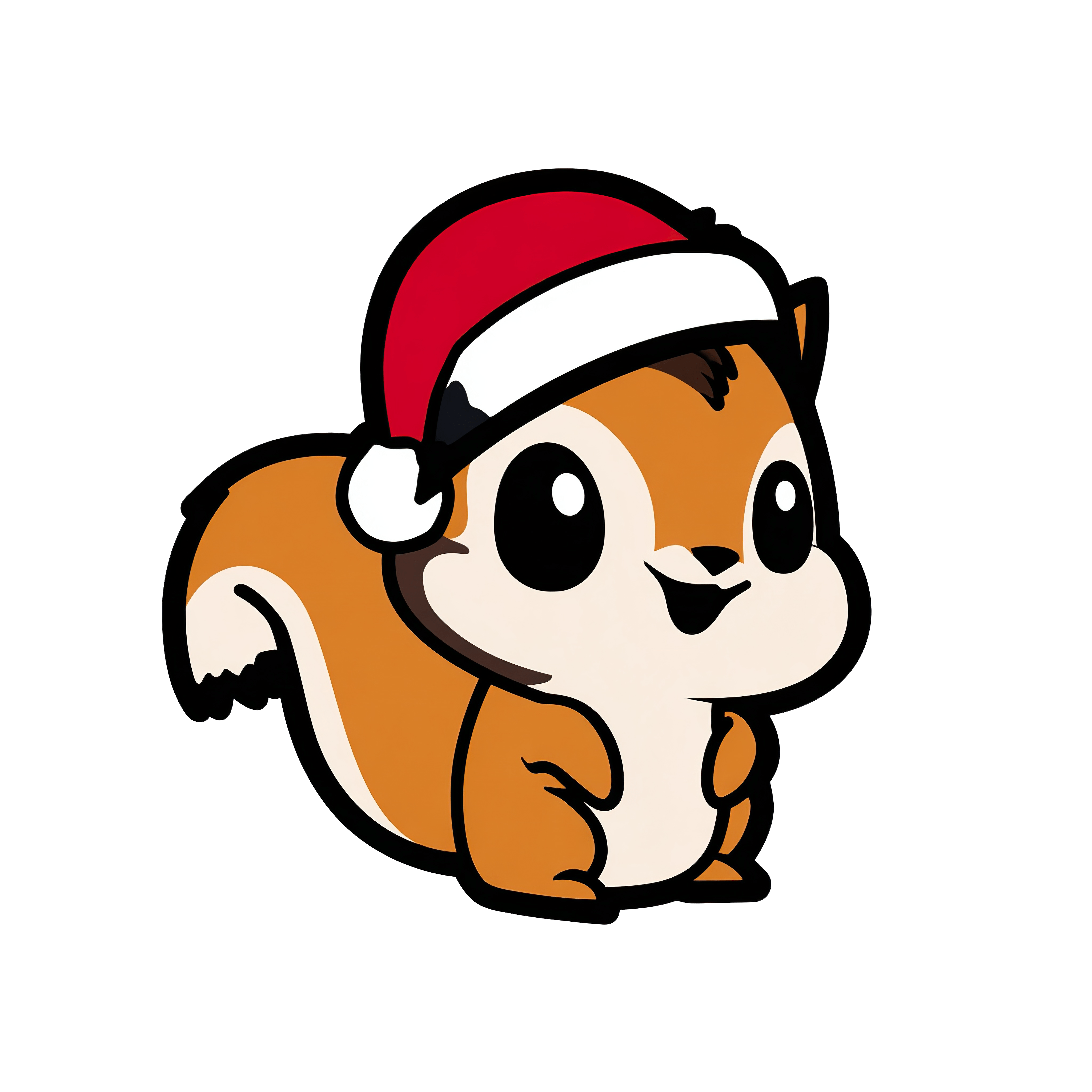 Squirrel wearing a red Santa hat, depicted in vector style. The squirrel features a brown and white color palette, emphasizing its cartoon-like characteristics. Its simple, outlined design provides a clean and modern look suitable for holiday-themed projects.