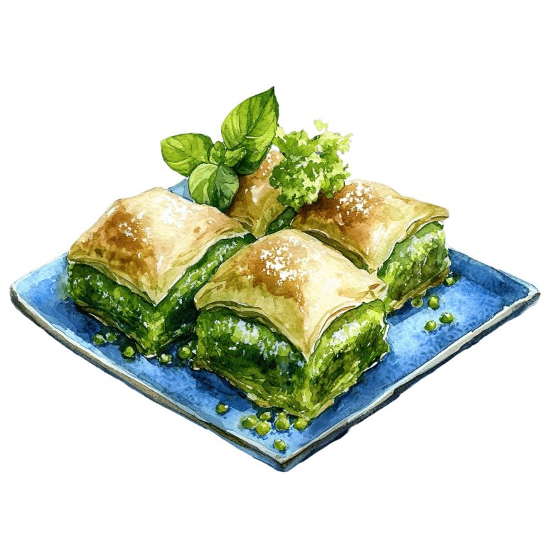 Watercolor Baklava with Pistachio Filling on Blue Plate