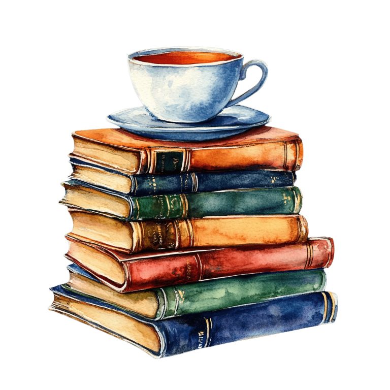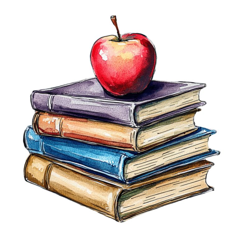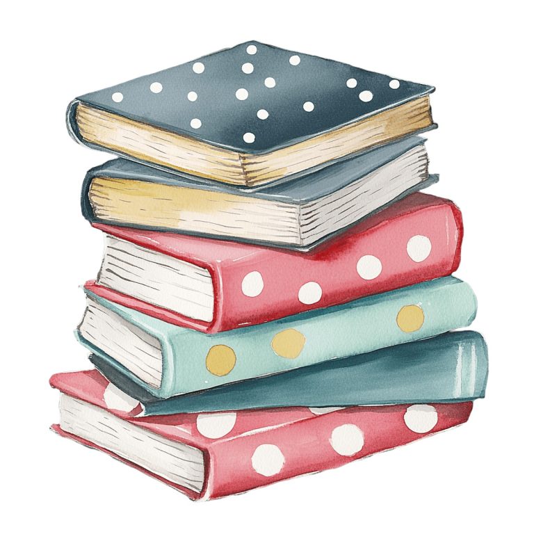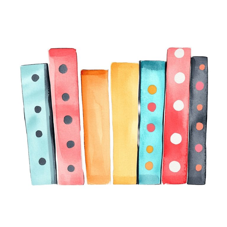 Colorful Books Arranged on Two Shelves in Watercolor Style