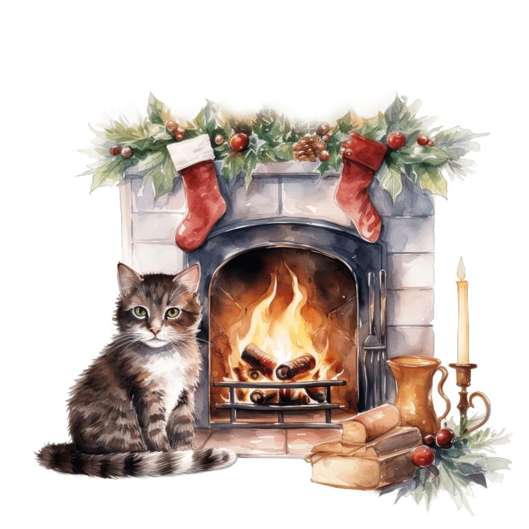 Cozy Fireplace with Stockings and Cat for Christmas Holiday