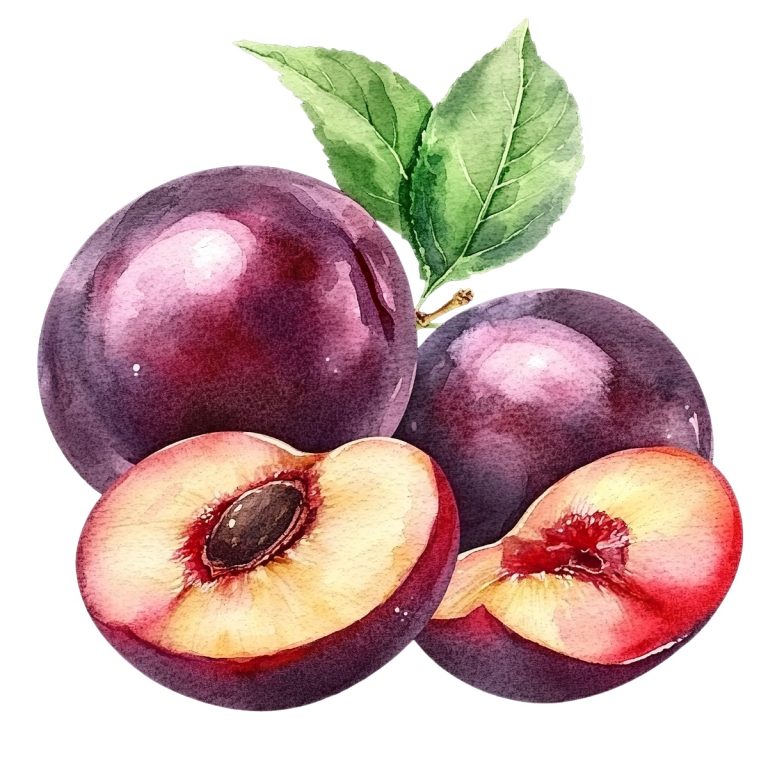 Lush Purple Plums and Leaves Botanical Clipart Art Watercolor depiction of whole and halved … Read more