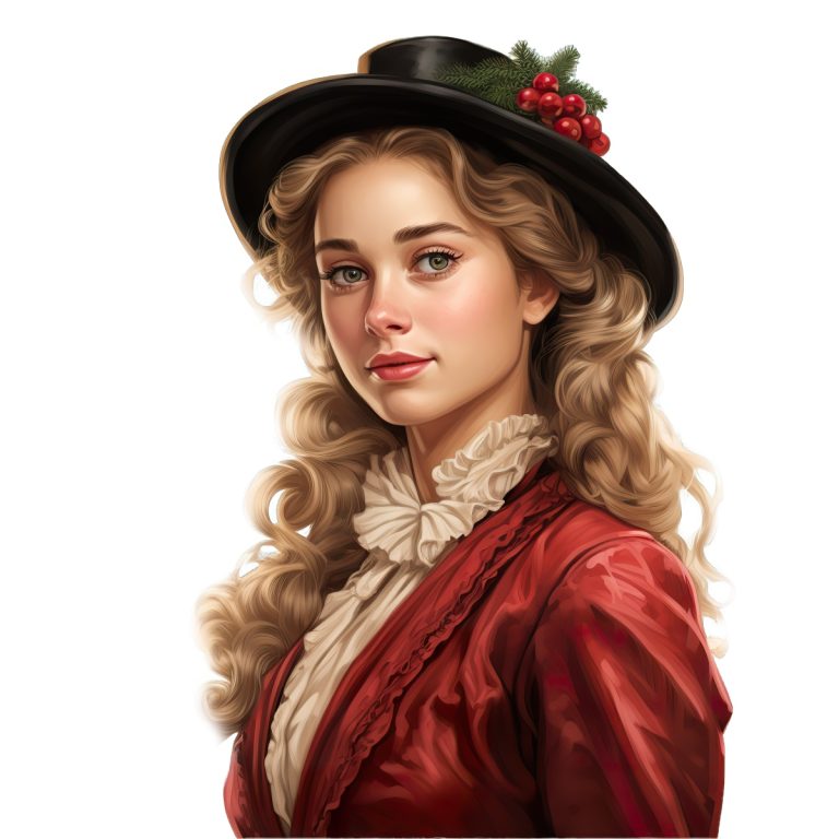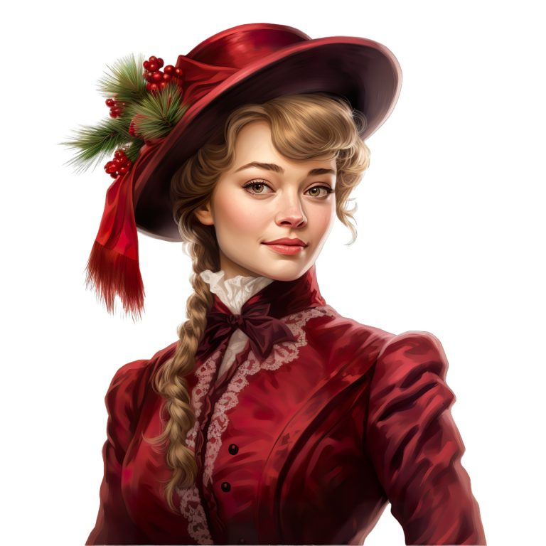 Victorian Woman in Red Christmas Outfit with Festive Hat