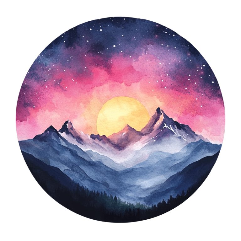Watercolor Landscape with Mountains and Night Sky in Circular Frame Watercolor mountain landscape with starry night … Read more