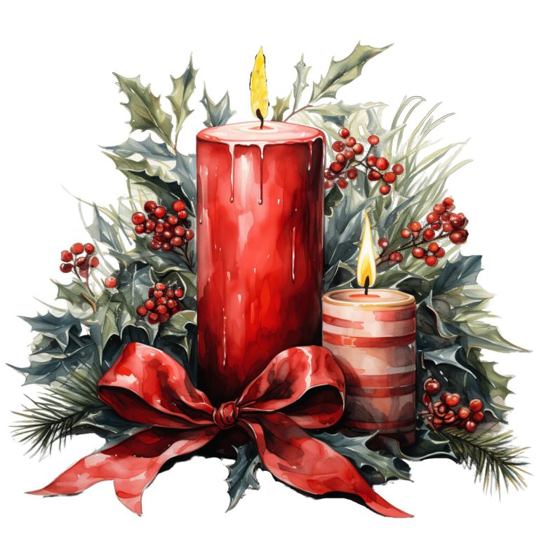 Wax Candle with Holly Leaves and Red Berries Illustration