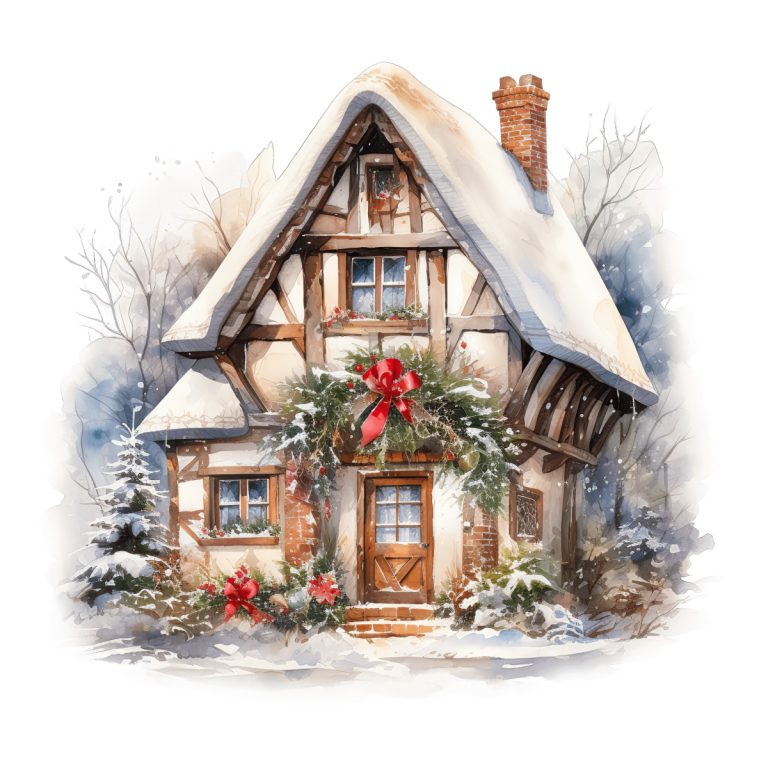 Snow-covered Cottage with Festive Decorations and Red Bows Snowy cottage adorned with holiday greenery … Read more