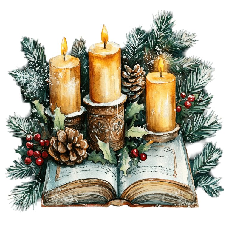 Three Burning Candles with Pinecones and Holly on Open Book Burning candles with pinecones and holly … Read more