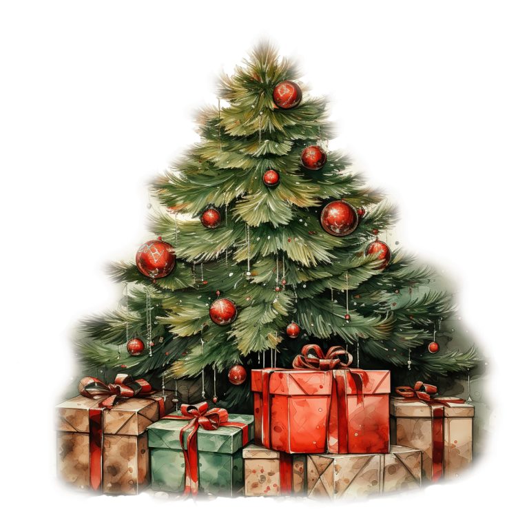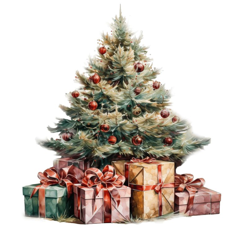 Decorated Christmas Tree with Wrapped Gifts and Ornaments