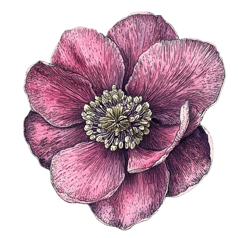 Detailed Pink Flower Illustration with Layered Petals and Yellow Center