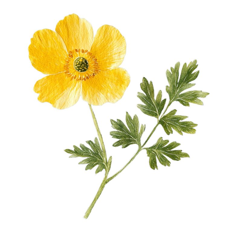 Yellow buttercup flower with green leaves … Read more