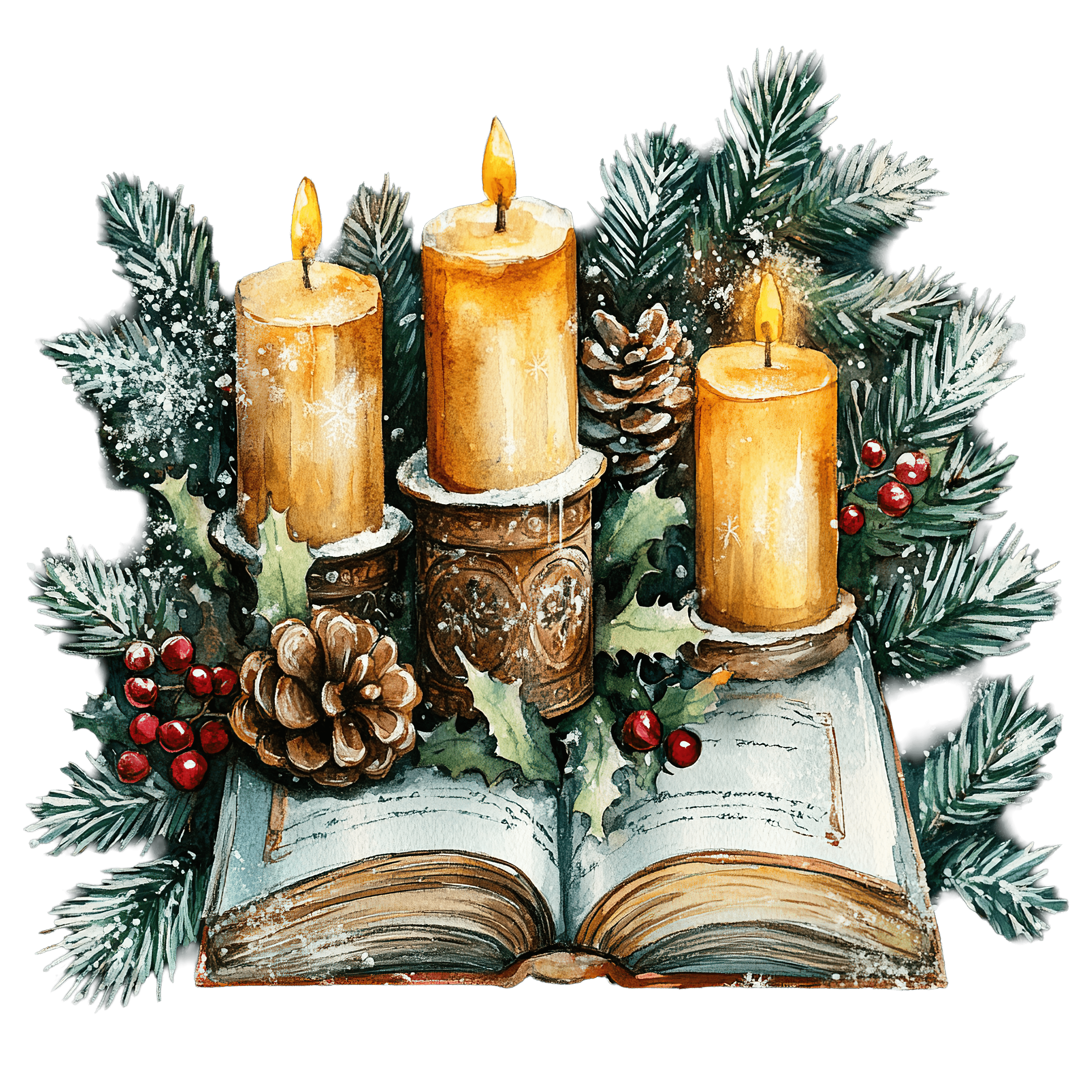 Three Burning Candles with Pinecones and Holly on Open Book Burning candles with pinecones and holly arranged on an open book.Download PNG ▼Download JPG ▼Related posts:Watercolor Cherry Blossom Branch with Pink and White PetalsArtistic Purple Grapes and Leaves Design ClipartLayered Chocolate Cake with Cream and Fresh CherriesDetailed watercolor illustration of pinecones with pine needlesBiscotti Cookies with Almonds in Watercolor Style food snack dessert clipart vectorVibrant Illustration of Open Book with Flowers and ButterflyGinger Root with Lemon and Honey Jar leaves food drink clipart vectorFresh Blackcurrant Cluster with Lush Green LeavesTall Glass of Iced Tea with Fresh Mint LeavesVibrant Butterfly With Purple And Orange Wings OnIced Tea Glass with Lemon and Mint GarnishSwiss Chard Leaf with Vibrant Red Stems Clipart