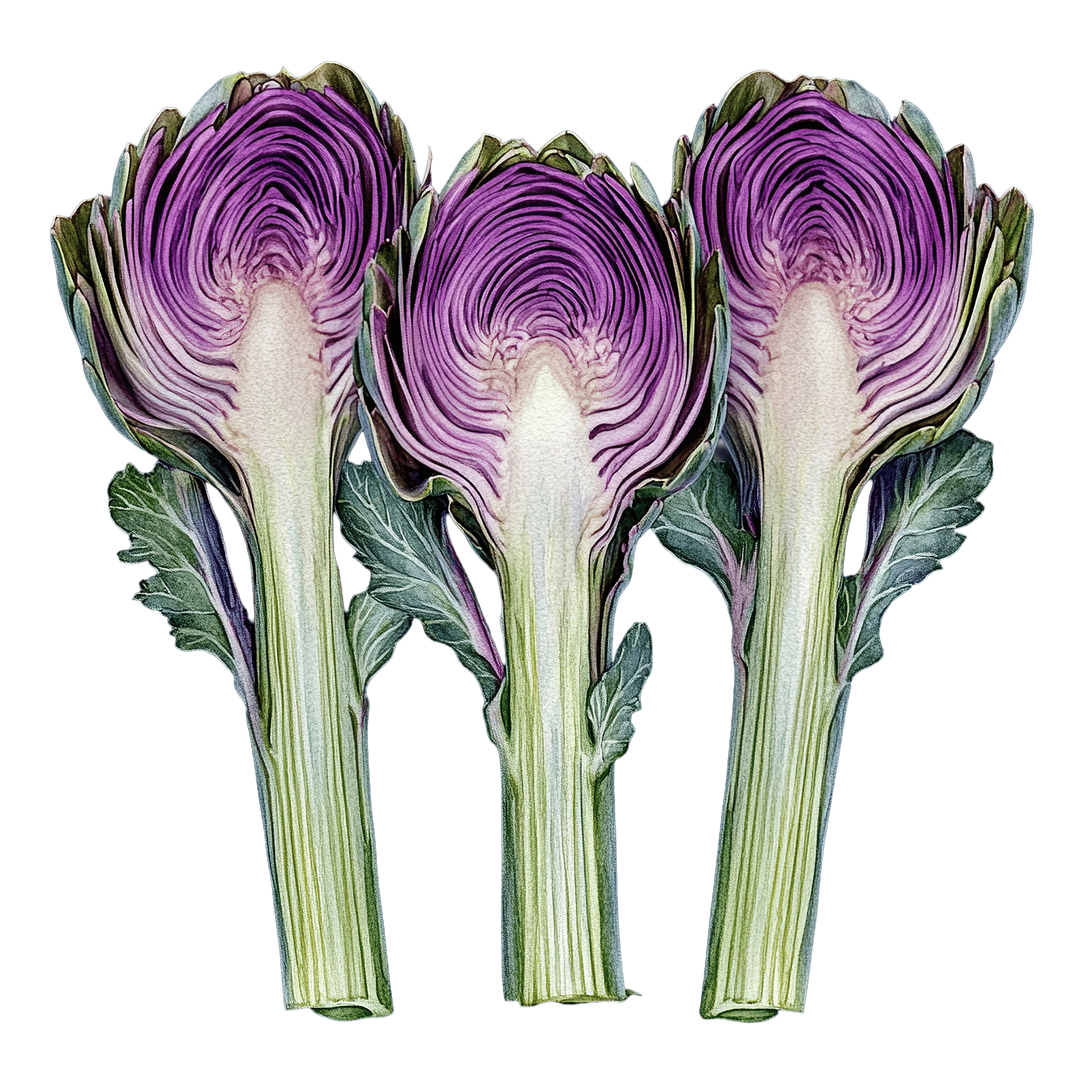 Three halved artichokes with vibrant purple interiors artichoke vegetable green food drink Three artichoke halves display intricate purple and green patternsDownload PNG ▼Download JPG ▼Related posts:Glass of Orange Juice with Lemon Slice GarnishRed Mushrooms with White Spots Among Wildflowers plants nature clipart vector artWatercolor Red Cabbage Half and Whole art vegetable clipart food purple freshSpicy Red Chili Pepper Vector Art with Green StemRed Tomato with Green Stem in Detailed ClipartLively Citrus Slice with Green Leaves Vector ArtWatercolor Poinsettia Flower with Green Leaves for Holiday DecorationBright Sun with Radiating Rays Behind Fluffy Clouds IllustrationRed and Green Christmas Bauble with White Leaf PatternsWatercolor Lychee Fruits with Leaves and Opened HalfWatercolor Mizuna Greens with Varied Leaf ShapesCartoon bird clipart with orange and gray plumage