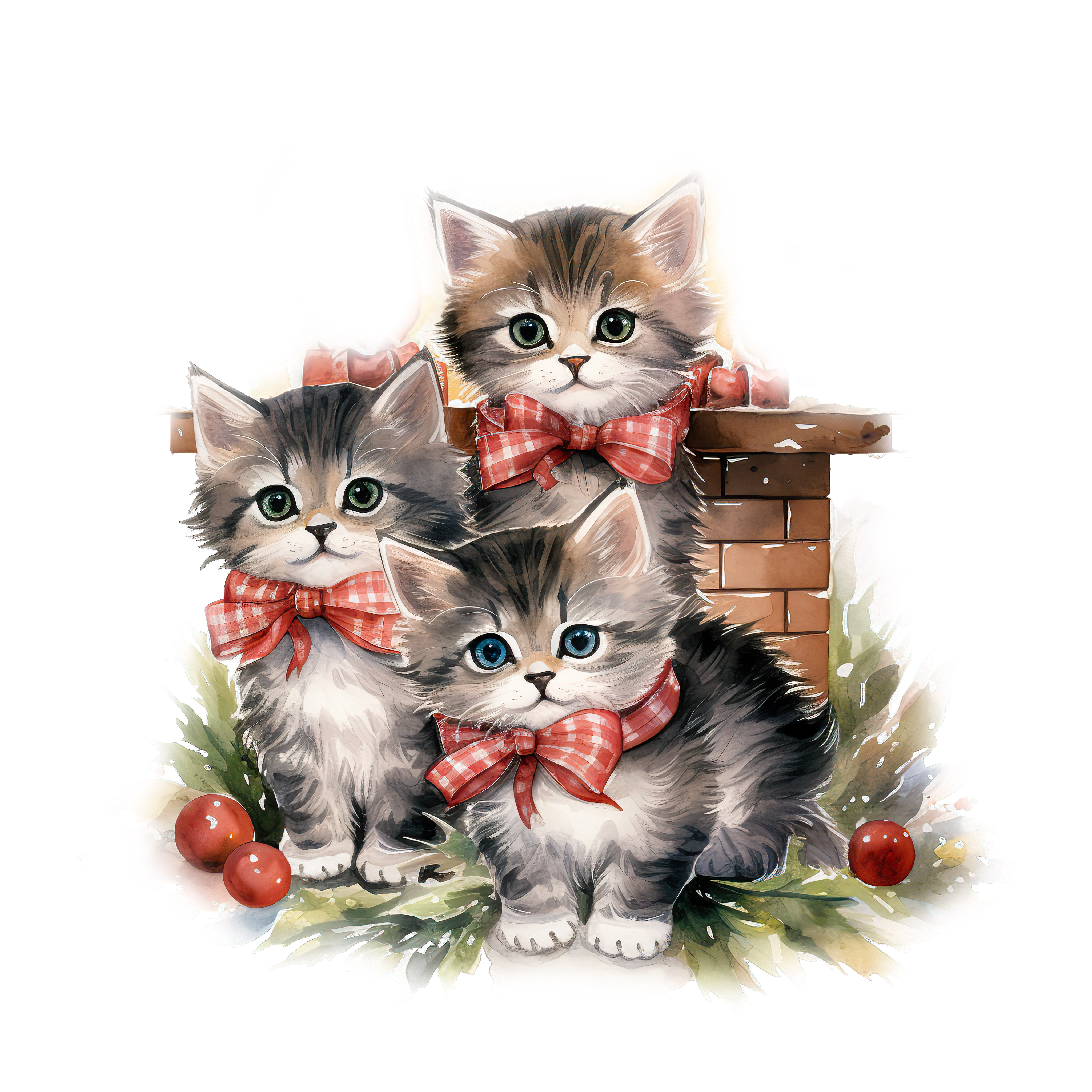 Three kittens with red bows near a festive Christmas chimney Three kittens with red bows sitting near a decorated Christmas chimney.Download PNG ▼Download JPG ▼Related posts:Cluster of Ripe Raspberries with Green Leaves fruit food branch clipart vectorSliced Kiwi Fruit with Vivid Green Flesh and SeedsGolden Bells with Red Bow and Holly for Christmas DecorationBunch of Fresh Green Onions Tied with StringPeach Bellini Cocktail with Fresh Peach SlicesGlass of Iced Coffee with Spoon and Ice CubesWatercolor Slice of Juicy Red Watermelon Clipart green fruit summer vector artDecorated Christmas Tree with Wrapped Gifts in Festive ColorsAlmonds Hanging on Branch with Green Leaves food drink clipart vector artBouquet of Red Roses Tied with a Shiny Red RibbonSanta Claus Holding Wrapped Gifts in Holiday TraditionOtter with Antlers Clipart Illustration