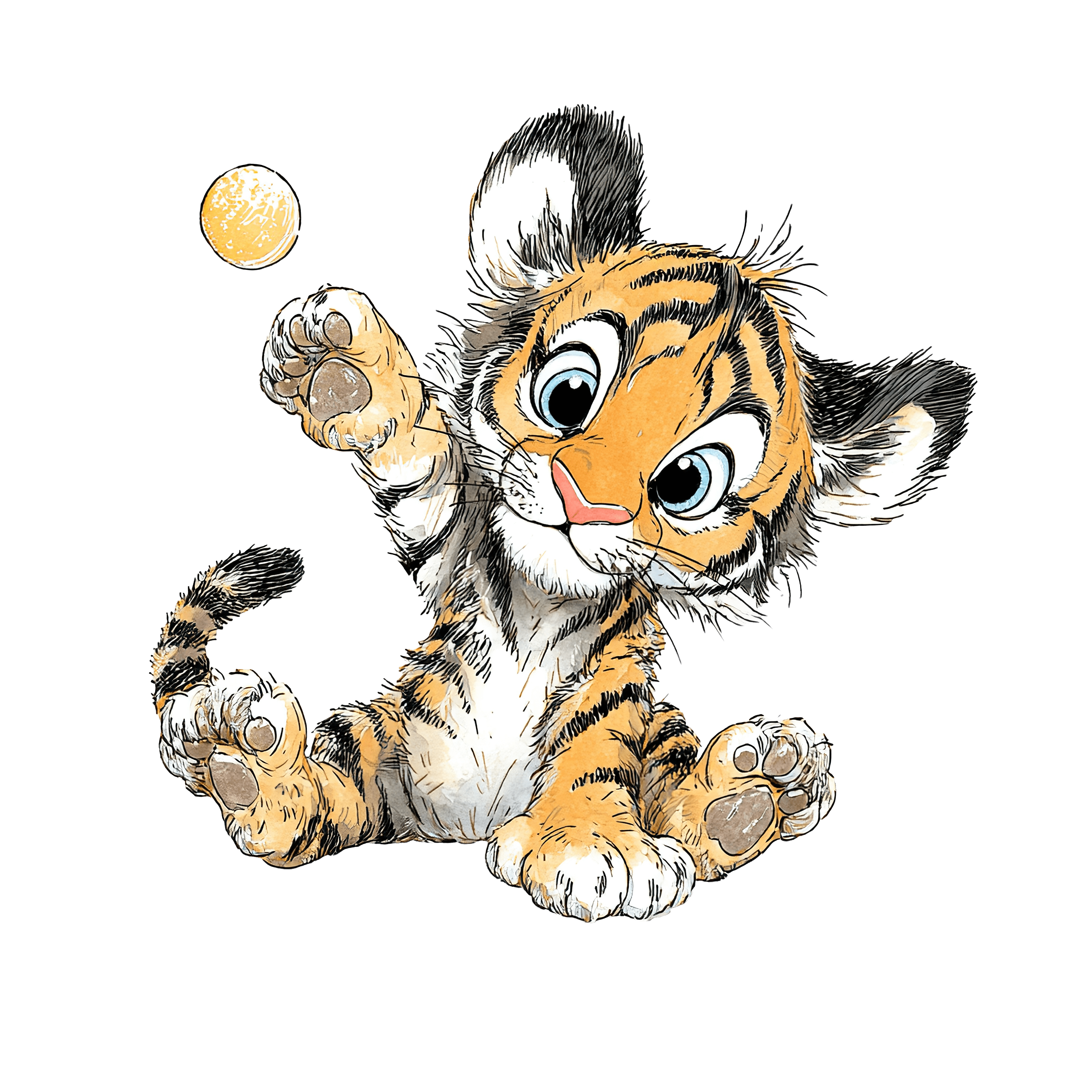 Tiger cub with distinctive orange and black stripes reaches playfully towards a yellow ball. Its large blue eyes and extended paw add to the dynamic feel of the illustration. The cub's white belly and paws contrast against the vibrant fur pattern, creating a lively design suitable for various projects.
