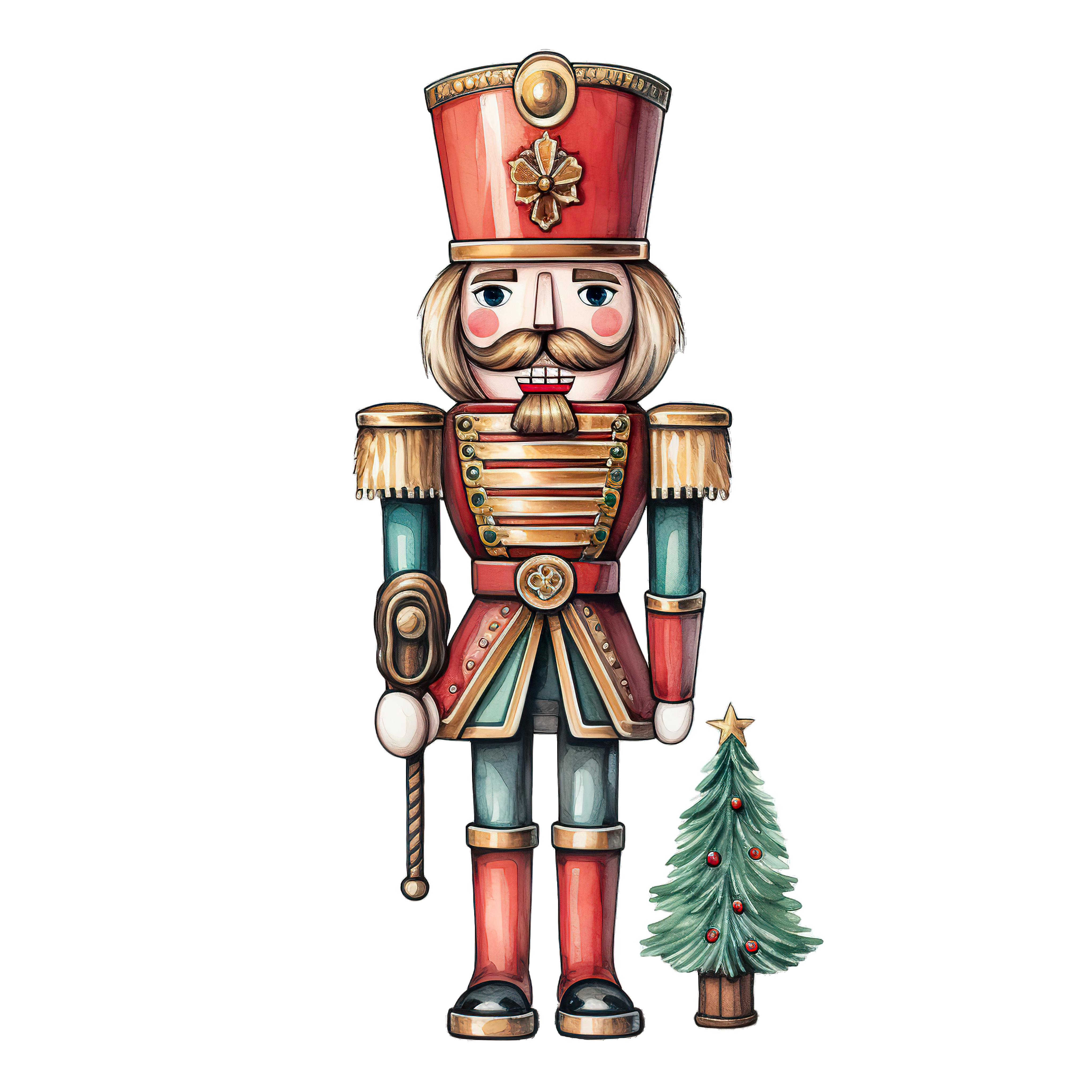 Traditional Nutcracker Soldier with Christmas Tree Illustration Decorative nutcracker soldier standing beside a festive Christmas tree.Download PNG ▼Download JPG ▼Related posts:Cartoon Character in Black Cape and Large Round GlassesLarge red mushroom with white spots and green grassLemon Tart Slice with Crumbly Crust and Lemon GarnishCurious Ape Branch Illustration PngStar-Shaped Gingerbread Cookie with Ornate Icing DesignWatercolor Bergamot Limes with Detailed Green Skin and LeavesElegant Cream Lily with Green Leaves on Black BackgroundGolden Brown Coconut Macaroons Dessert Sweet Baked Food ClipartDetailed Illustration Of A Purple And Orange ButterflyWhole and Halved Apricot with Green Leaves ClipartLush Strawberries with Green LeavesOtter balancing on pink ball illustration