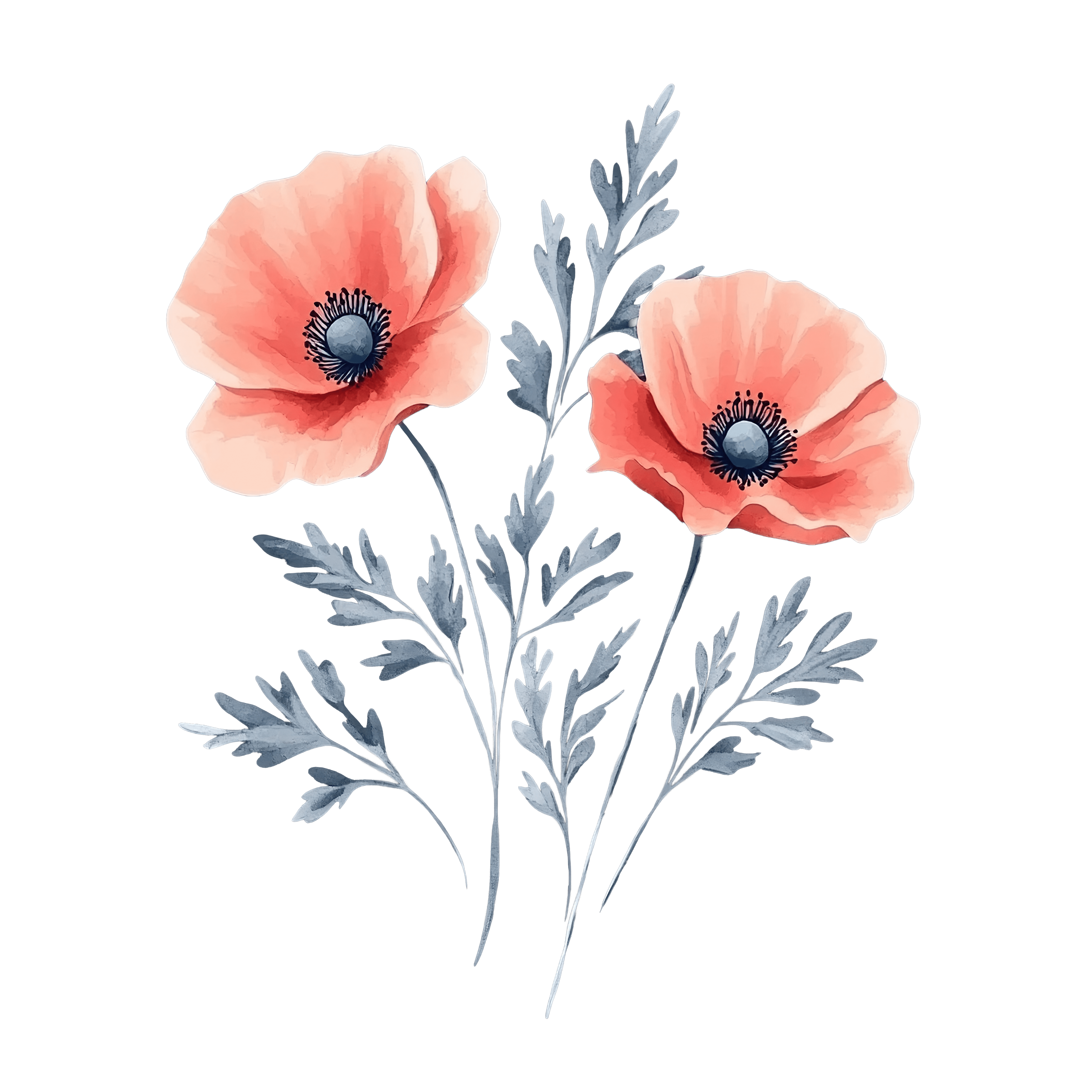 Two Red Poppies with Silver-Green Leaves on Black Background Red poppies with silver-green leaves in detailed watercolor style.Download PNG ▼Download JPG ▼Related posts:Turtle with Colorful Beach Ball Clipart IllustrationRed Candle Arrangement with Holly Leaves and Festive RibbonWatercolor Mizuna Greens with Varied Leaf ShapesVibrant Watercolor Butterfly Art With Pink And PurpleWatercolor Illustration of Pink Bougainvillea Flowers with Green LeavesWoman with Large Red and Gold Bow and Green DressGlass of Mulled Wine with Orange SliceStack of Colorful Illustrated Books with Vibrant CoversBlue bird with fluffy feathers clipart illustrationYellow Cartoon Character with Big Eyes and Dripping TextureGolden Crust Egg Tart Vector Art DessertBright Yellow Daffodil Flowers with Green Stems Illustration