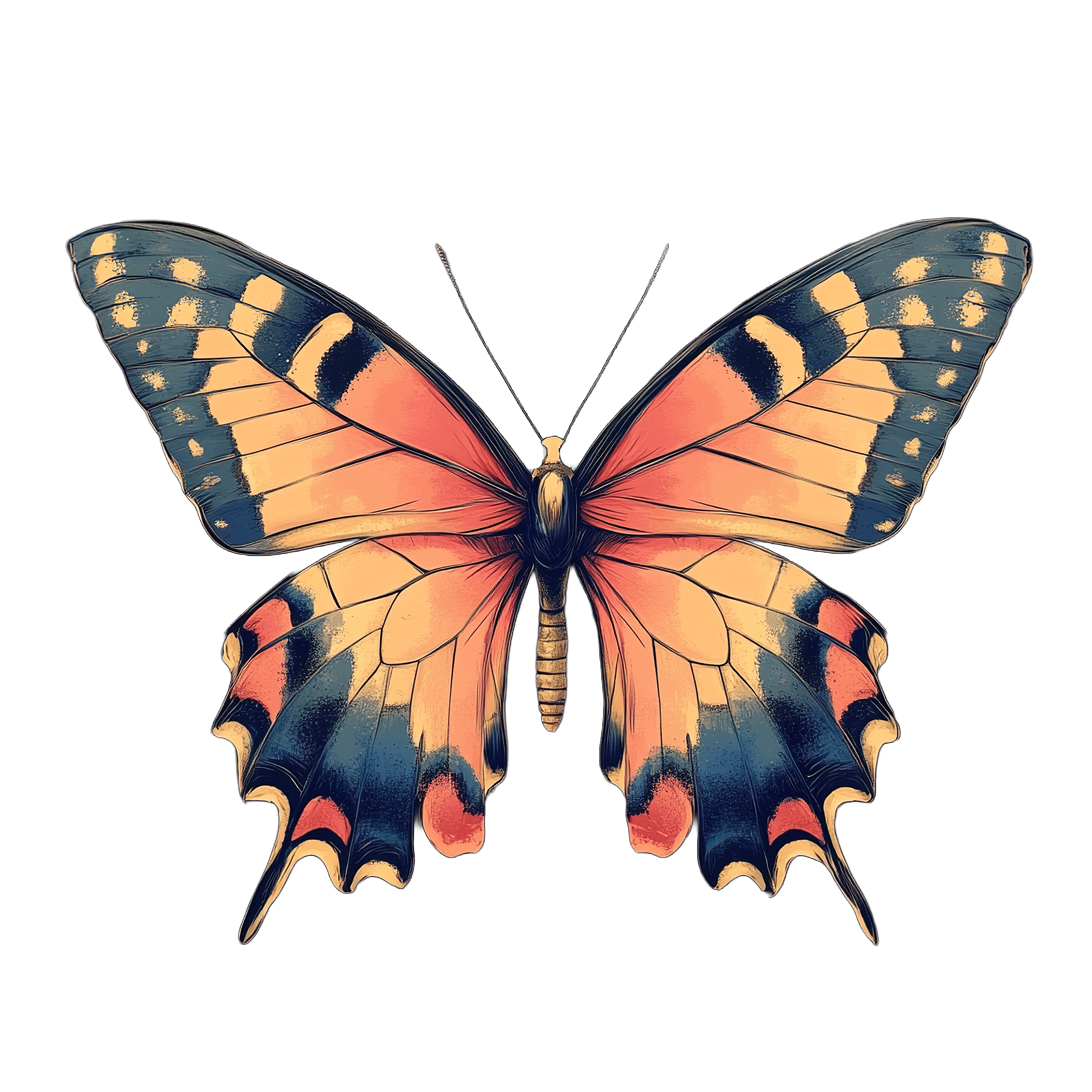 Vibrant Butterfly With Intricate Patterns In Flight Butterfly with vibrant orange and purple wings displayed on black.Download PNG ▼Download JPG ▼Related posts:Watermelon Slice with Seeds and Green Rind fruit red clipart vector artTraditional Christmas Holly with Red Berries and Green LeavesWatercolor Orange Slices with Detailed TextureIntricate Decorative Floral Mandala in Earthy and Teal TonesWooden Garden Arbor with Blooming Pink Climbing RosesDetailed Green Lettuce Leaves Texture DesignWatercolor Cherry Blossom Branch with Delicate Pink PetalsSmiling Sun Illustration with Radiating Yellow Rays on BlackSlice of Cheesecake with Figs and Pink Drizzle ToppingHoney Drizzled Cake with Strawberries and Honey DipperThree ripe jaboticaba berries with green leaves on branchDetailed Botanical art of a Plant with Roots