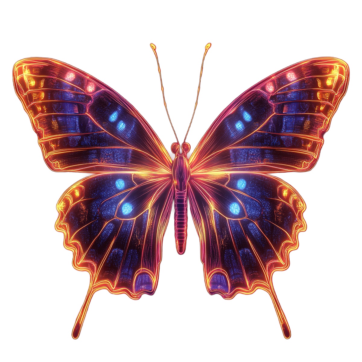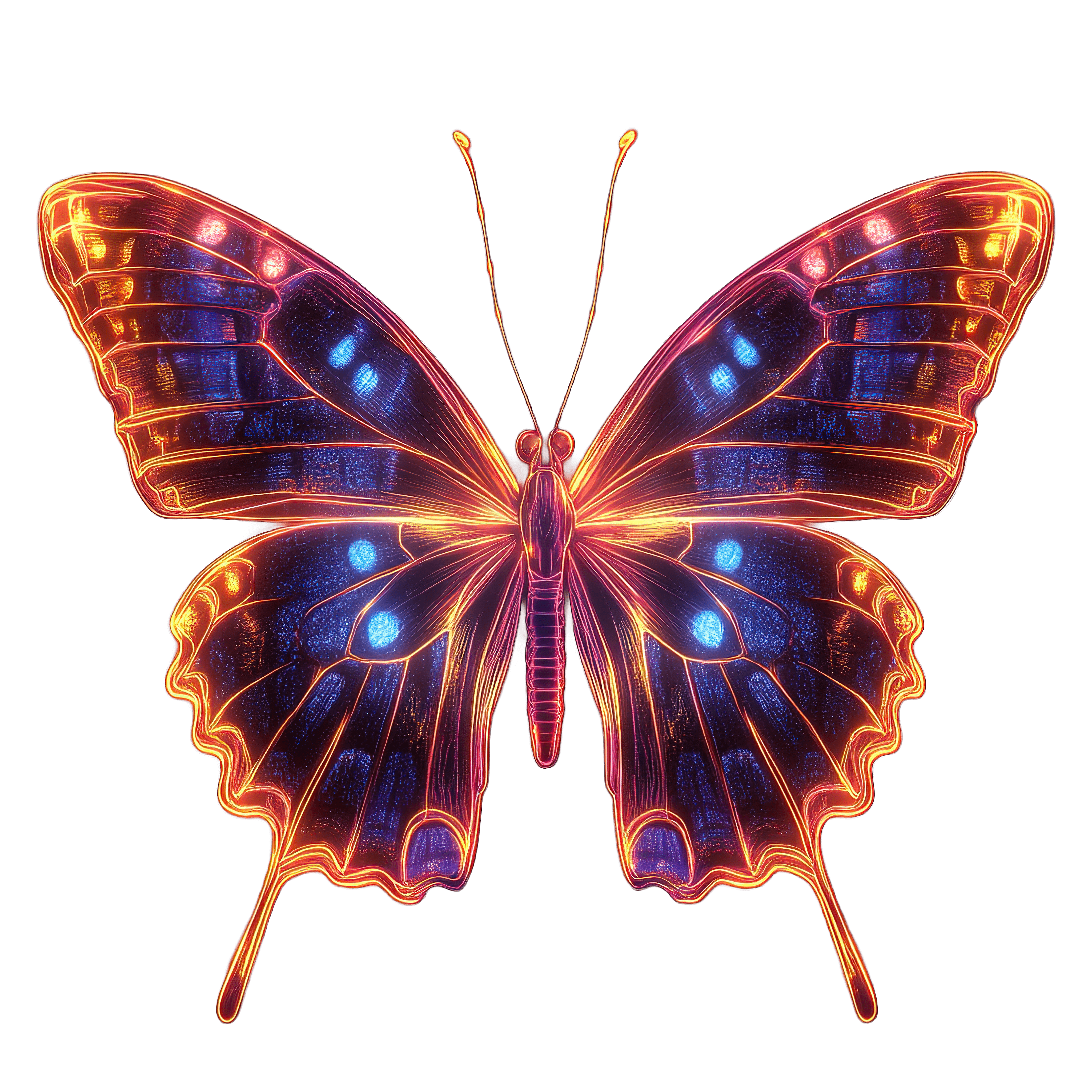 Vibrant Neon Butterfly Illustration With Bright Lively Colors Neon butterfly illustration featuring vibrant colors against a black background.Download PNG ▼Download JPG ▼Related posts:Purple And Cream Butterfly With Detailed Wing PatternsIntricately Designed Red and White Decorative Cookie ClipartPink Milkshake with Cherries and Whipped Cream ToppingVividly Detailed Art Of A Butterfly Displaying ItsBright Sun Illustration with Fiery Orange and Yellow RaysWatercolor Cranberries with Green Leaves on BranchHamster with Pumpkins Clipart on Transparent BackgroundSliced Brown Bread Loaf with Textured Surface texture food clipart vector artWatercolor art of Whole and Halved Green MelonWhite Calla Lily with Green Leaves on Black BackgroundGingerbread Man with Christmas Hat and Holly DecorationsIllustration of a Woman with Red Hair and Bow Tie