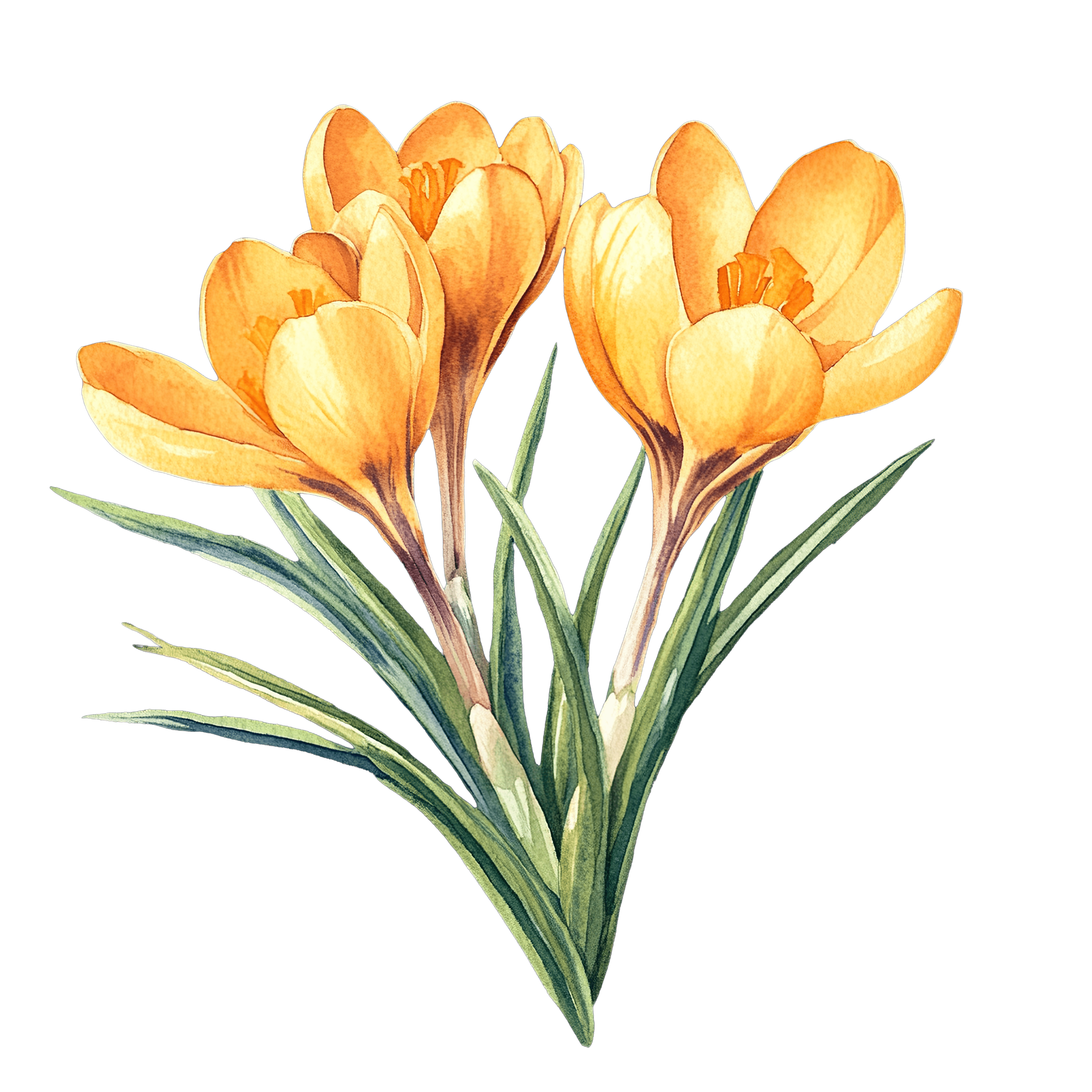 Vibrant Orange Crocus Flowers with Green Leaves Illustration Orange crocus flowers with green leaves in a detailed watercolor style.Download PNG ▼Download JPG ▼Related posts:Deer Head with Antlers in a Festive Christmas WreathStrawberry Topped Cupcake with Pink Frosting in WrapperSliced Yellow Melon with Visible Seeds fruit juicy clipart vector art printableParsnip Bunch with Fresh Green Leaves ClipartWhite Ceramic Mug Filled with Black Coffee ClipartGreen and Red Santa Hat with White Pom-Pom and SnowflakesLychee Fruit and Juice with Fresh Leaves drink red white glass beverageBotanical Parsnip Clipart with Rich Green FoliageColorful Geometric Patterned Bell Pendant on Black BackgroundVibrant Butterfly Showcasing Multicolored Rainbow WingsThree Lit Candles with Pinecones and Evergreen Foliage for Festive DecorGlass of Orange Juice with Ice and Orange Slices