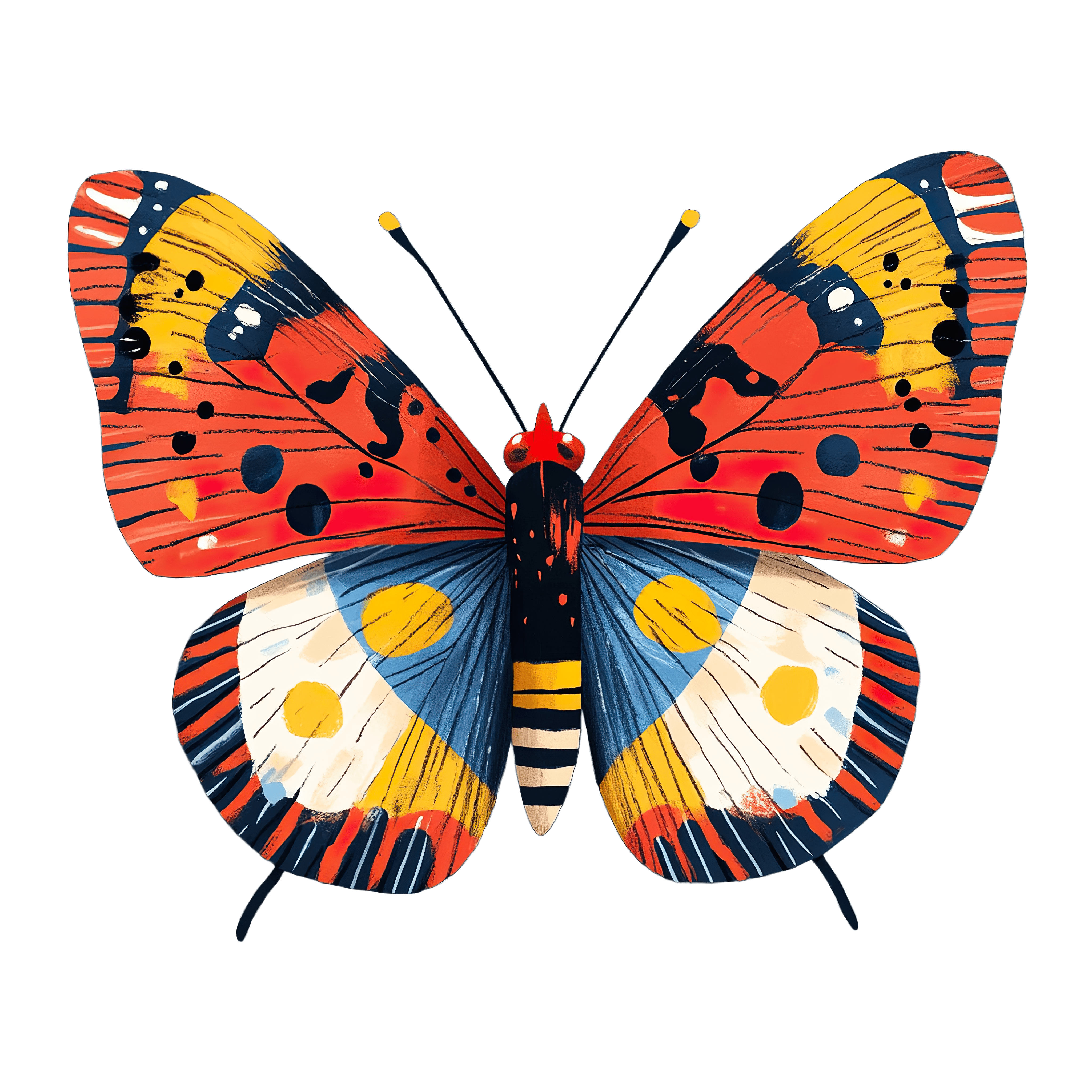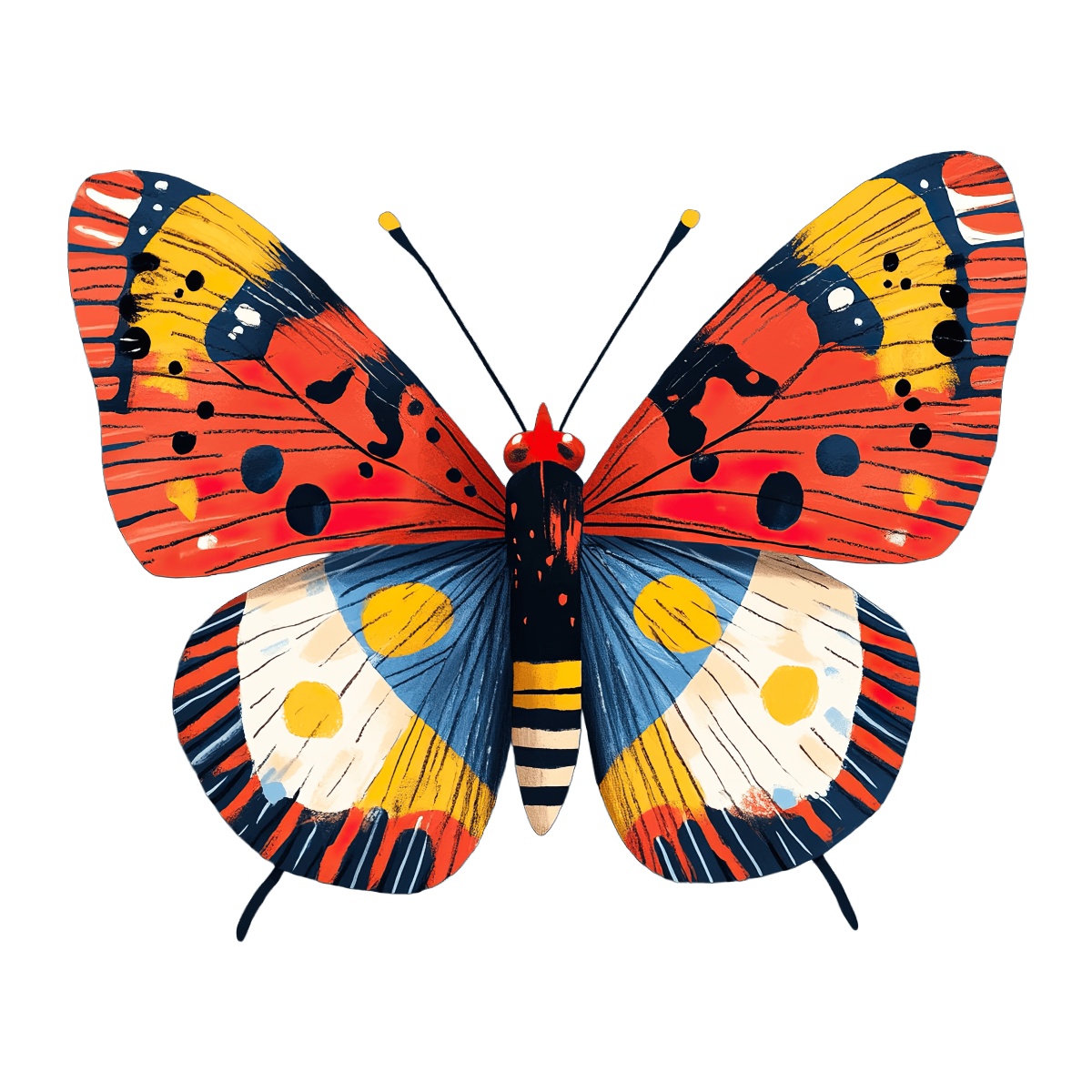 Vibrant Patterned Butterfly With Colorful Wings Butterfly illustration featuring bold colors and intricate patterns.Download PNG ▼Download JPG ▼Related posts:Blue and Purple Morning Glory Flowers with Detailed LeavesWatercolor oranges with leaves and a sliced sectionRed Currants and White Flowers with Green LeavesIntricate Gingerbread Cookie Design with Red and Teal IcingVibrant Watercolor Butterfly Art With Pink And PurpleThree watercolor bell peppers in yellow, red, and greenFresh Apricots with Leaves and Halved Fruit DisplayMulled Wine Glass with Lemon and Cinnamon StickGlass of Tomato Juice with Fresh Tomatoes beverage red drink clipart vectorCartoon llama leaping over rocks illustrationWatercolor Broccoli Stalks with Detailed Green Florets vegetable clipart food vector artTraditional Christmas Panettone with Holly and Festive Garnishes