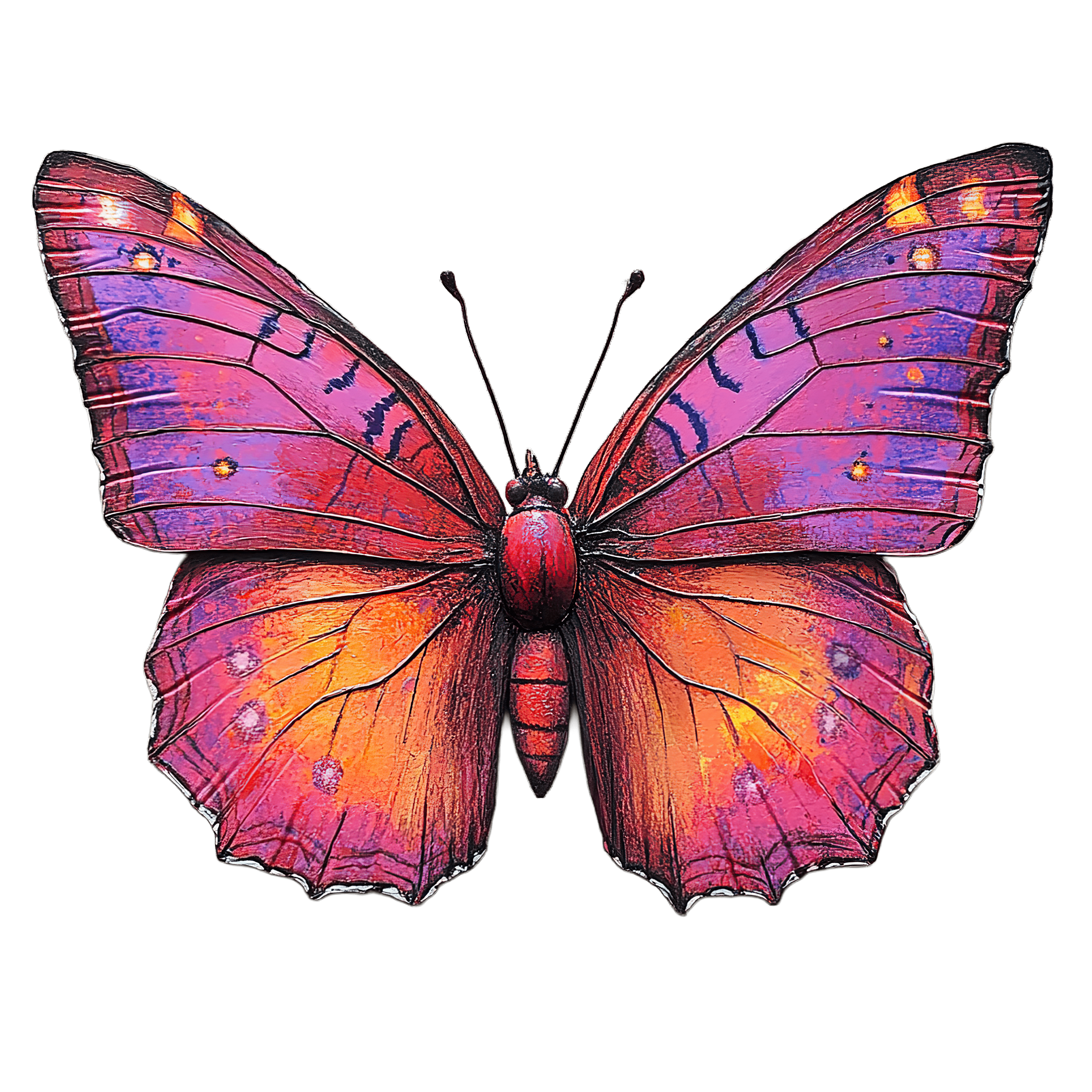 Vibrant Purple And Orange Butterfly Illustration Butterfly with detailed purple and orange wings against a black backdrop.Download PNG ▼Download JPG ▼Related posts:Orange Sorbet with Leaves and Sliced CitrusSparkling Orange Butterfly With Glittering WingsFresh Green Lettuce Leaves in Detailed Vector ArtSmiling Sun with Curved Rays on Black BackgroundStack of Colorful Books with Polka Dot CoversYellow starfish with dotted texture cartoon designSpiral Cinnamon Pastry with Sugar DustingPink Flamingo Bird Vector Clipart IllustrationTwo Purple Cherries Hanging from a Branch with LeavesSliced Braided Fruit Bread with Sugar Dusting on TopWatercolor Christmas Snowflake with Green and Red LeavesVibrant Butterfly With Pink And Orange Wings In