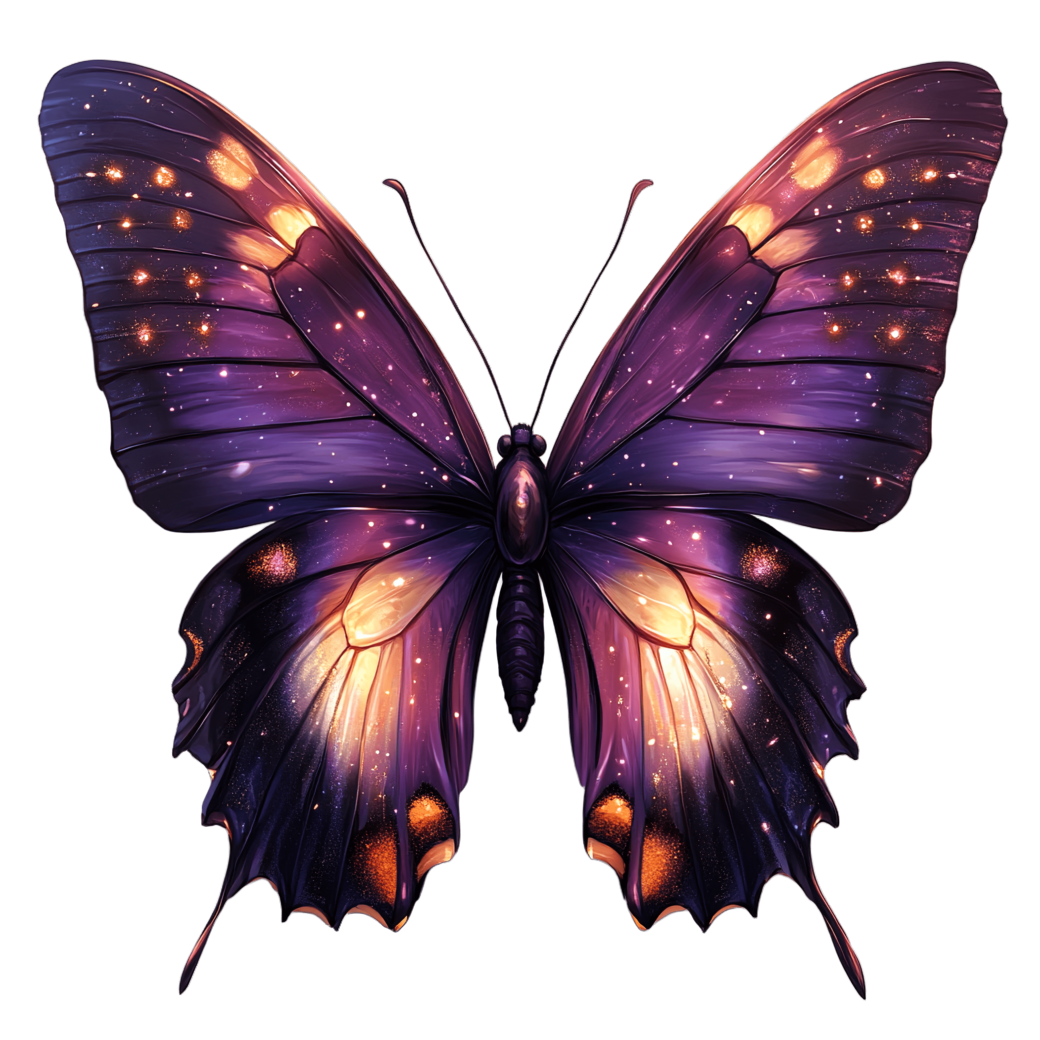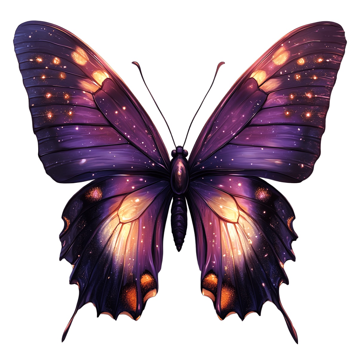 Vibrant Purple Butterfly With Starry Wing Patterns Wings Butterfly features purple wings with star-like patterns and orange accents.Download PNG ▼Download JPG ▼Related posts:Traditional Christmas Nutcracker Soldier in Red Uniform Clipart ImageVibrant Multicolored Kayak Illustration on Black BackgroundLush Red Cherries with Fresh Green Leaves Vector ArtDetailed Illustration Of An Orange And Black ButterflyArtistic Sun with Central Heart Shape on Black BackgroundRed Currant Berries with Green Leaves on StemGlass of Red Juice with Detailed Line ArtChocolate Glazed Cake with a Slice Removed glaze dessert food sweet bakedGreen bird illustration with orange cheeksWatercolor Quince Fruits with Leaves and Sliced HalvesVibrant Pink And Blue Butterfly With Detailed WingWhole and Sliced Grapefruit with Vibrant Pink Flesh