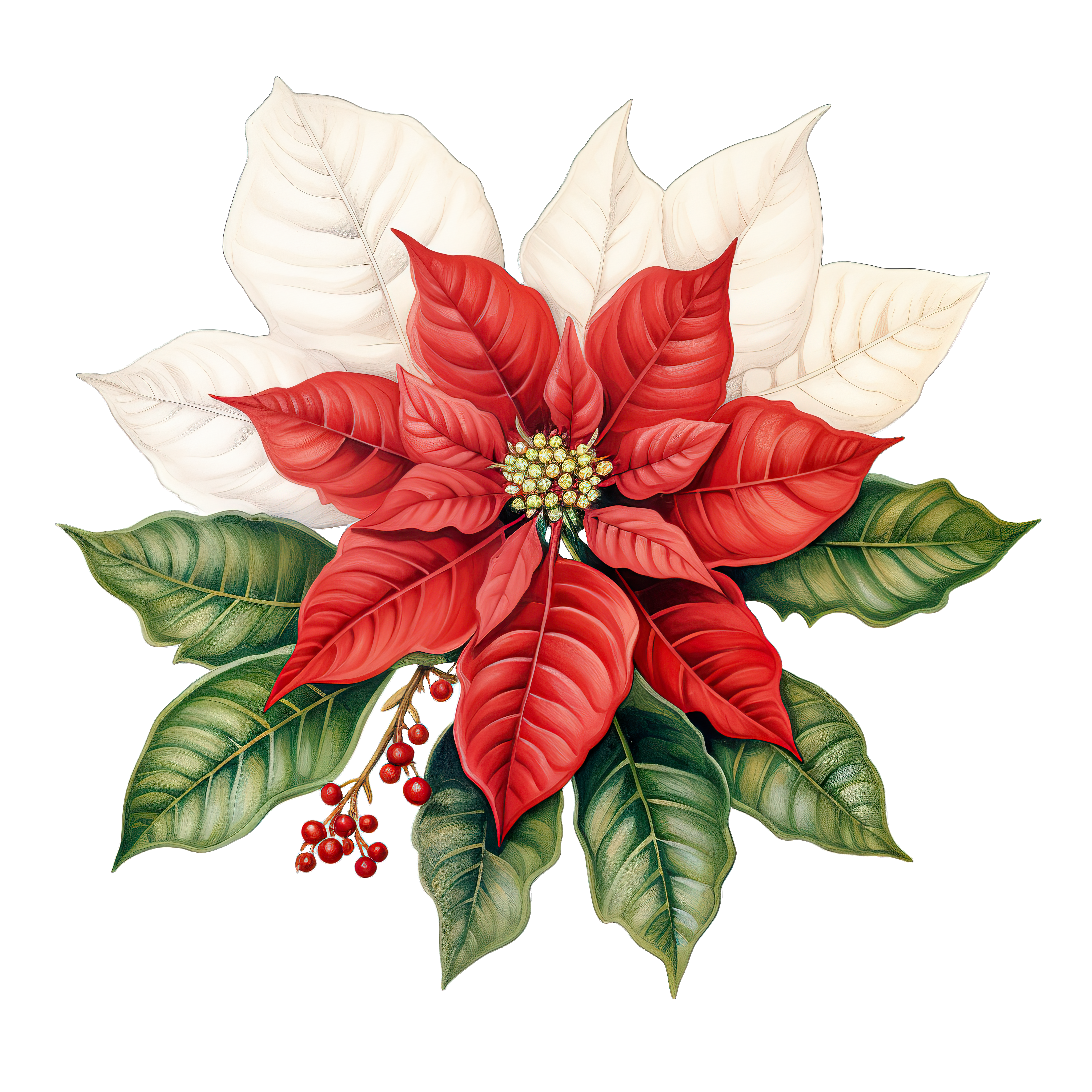Vibrant Red and White Poinsettia with Green Leaves and Berries Red poinsettia with white leaves and green foliage, symbolizing holiday festivities.Download PNG ▼Download JPG ▼Related posts:Vibrant Green Onions with Long Stalks and Roots ClipartVibrant Butterfly Artwork With Open Wings In DetailedCartoon otter with orange and white furBlue-green succulent plant with rosette shape and pointed leavesHalf Coconut with Straw for Tropical Beverage drink brown white clipart vectorVibrant Butterfly Art With Open Wings A DetailedShimmering Blue Butterfly With Radiant Wings DisplayOwl Perched in Festive Wreath with Red Berries and LeavesFreshly Baked Baguette with Golden Crust and TextureOpened Passion Fruit with Visible Seeds in Artistic StyleWatercolor Assorted Berry Collection Vector Art Printable FruitBright Yellow Seahorse with Bubbles Clipart