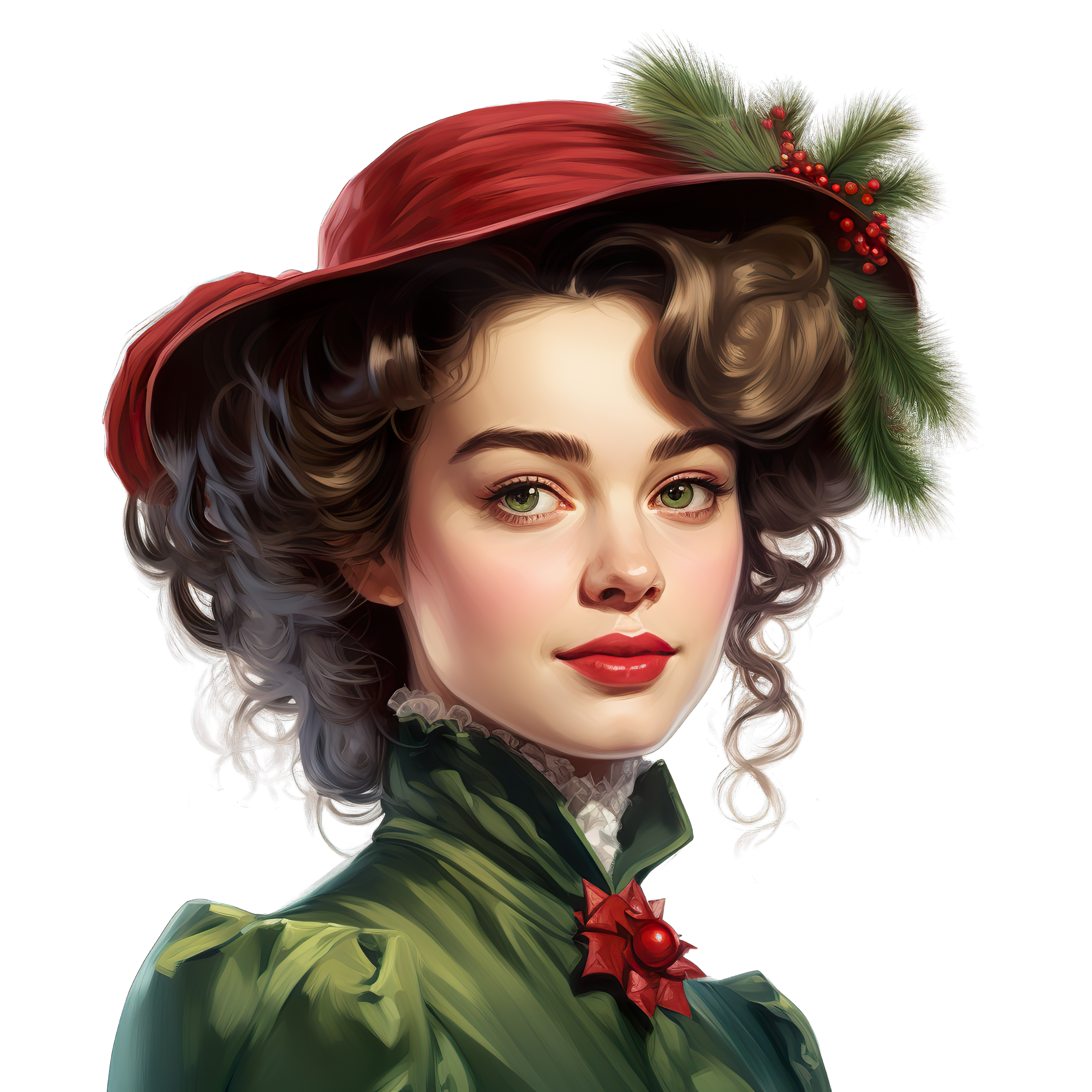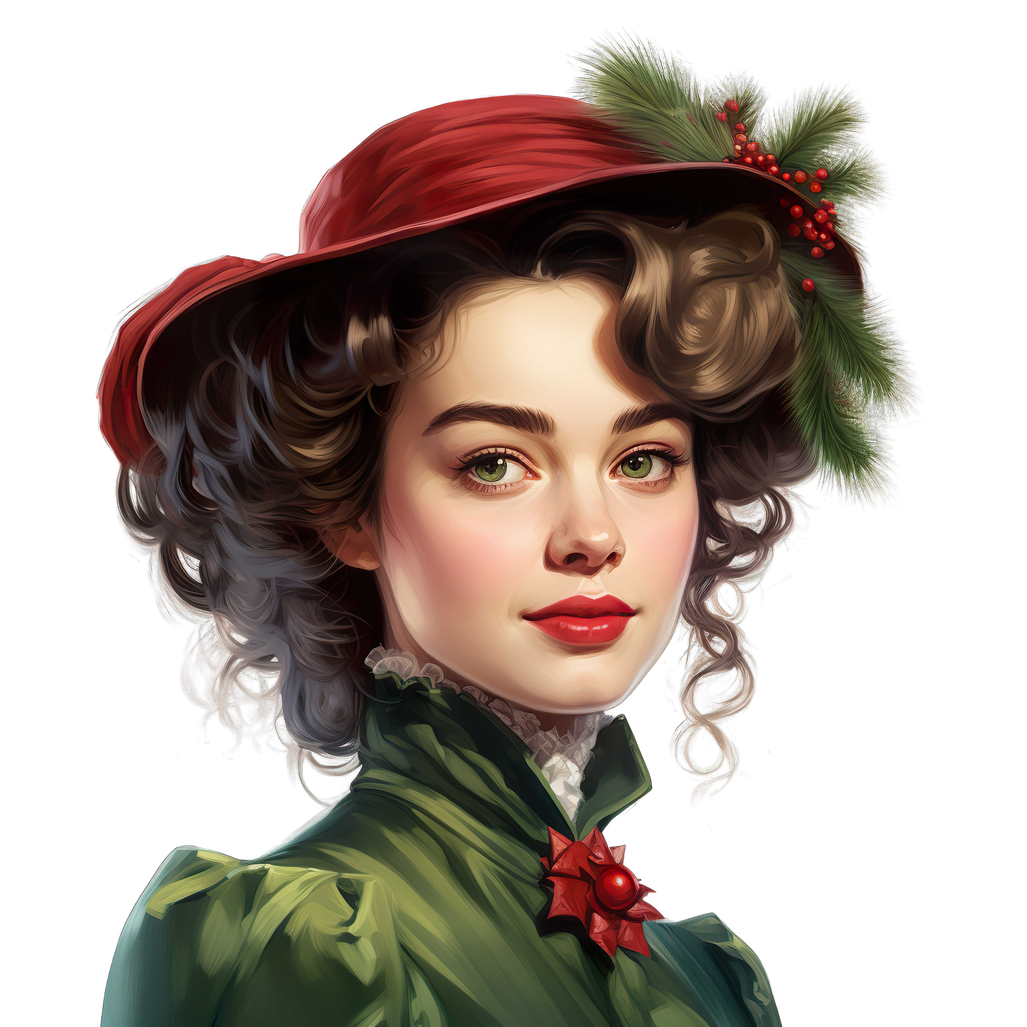 Victorian Woman Wearing Red Holiday Hat with Green Dress Victorian woman in festive red hat and green dress with holly accents.Download PNG ▼Download JPG ▼Related posts:Cartoon lizard in Santa suit standing uprightTurtle wearing a red and green festive hatWatercolor art of Fresh Green Spinach Leaves clipart vector vegetable plant botanicalVibrant Purple And Orange Butterfly With Detailed WingsThree watercolor bell peppers in yellow, red, and greenColorful Watercolor Turnip with Lush Green LeavesYoung girl portrait adorned with festive poinsettia flowers.Vivid Orange Carrot Art with Fresh Green FoliageWatercolor art of Whole and Halved Pears with LeafWatercolor Artichoke with Green Leaves and Stem vegetable clipart food plant artOrange goldfish cartoon clipart illustrationThree Green Pea Pods in Watercolor Style peas food vegetable clipart vector