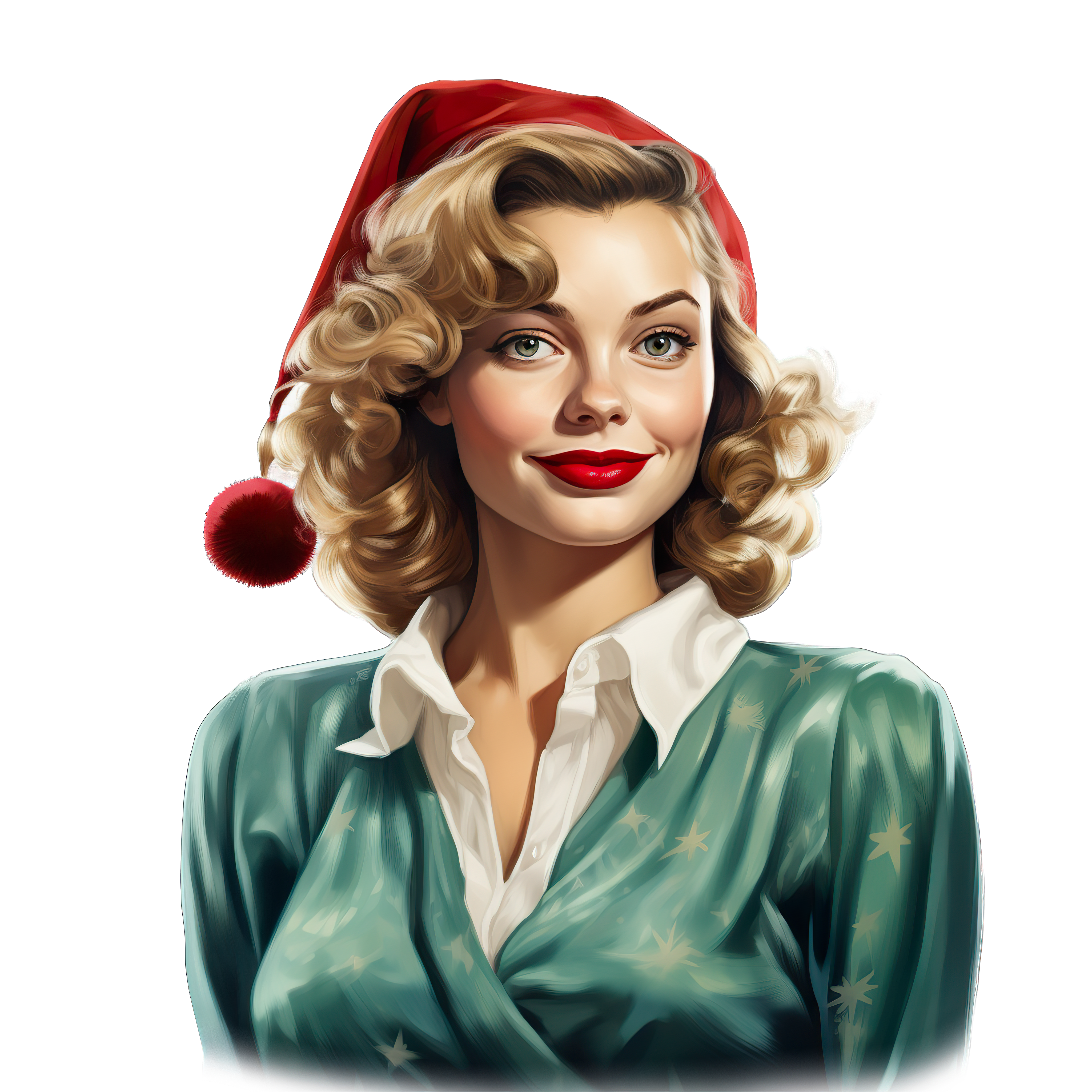 Vintage Style Woman with Santa Hat and Festive Green Dress Woman with vintage hairstyle wearing a Santa hat and festive outfit.Download PNG ▼Download JPG ▼Related posts:Elegant Woman in Victorian Era Clothing with Lace TrimmingsGingerbread Man Cookie with White Icing and Bow Tie IllustrationVibrant Orange And Pink Butterfly With Glittering DetailsGlass of Orange Juice with Ice and Orange SlicesDetailed Botanical art of Seed Pods and LeavesFresh Green Broccoli with Detailed Leaves and StemsWatercolor Teacup with Red Heart Design on BlackMonstera Leaves in Watercolor Style Clipart DesignYellow Zucchini with Green Leaves in Detailed ClipartChocolate Drizzled Cake Slice with Fresh Berries on TopCapybara Illustration in Simplified Clipart StyleCartoon Lion in Regal Purple Robe Clipart