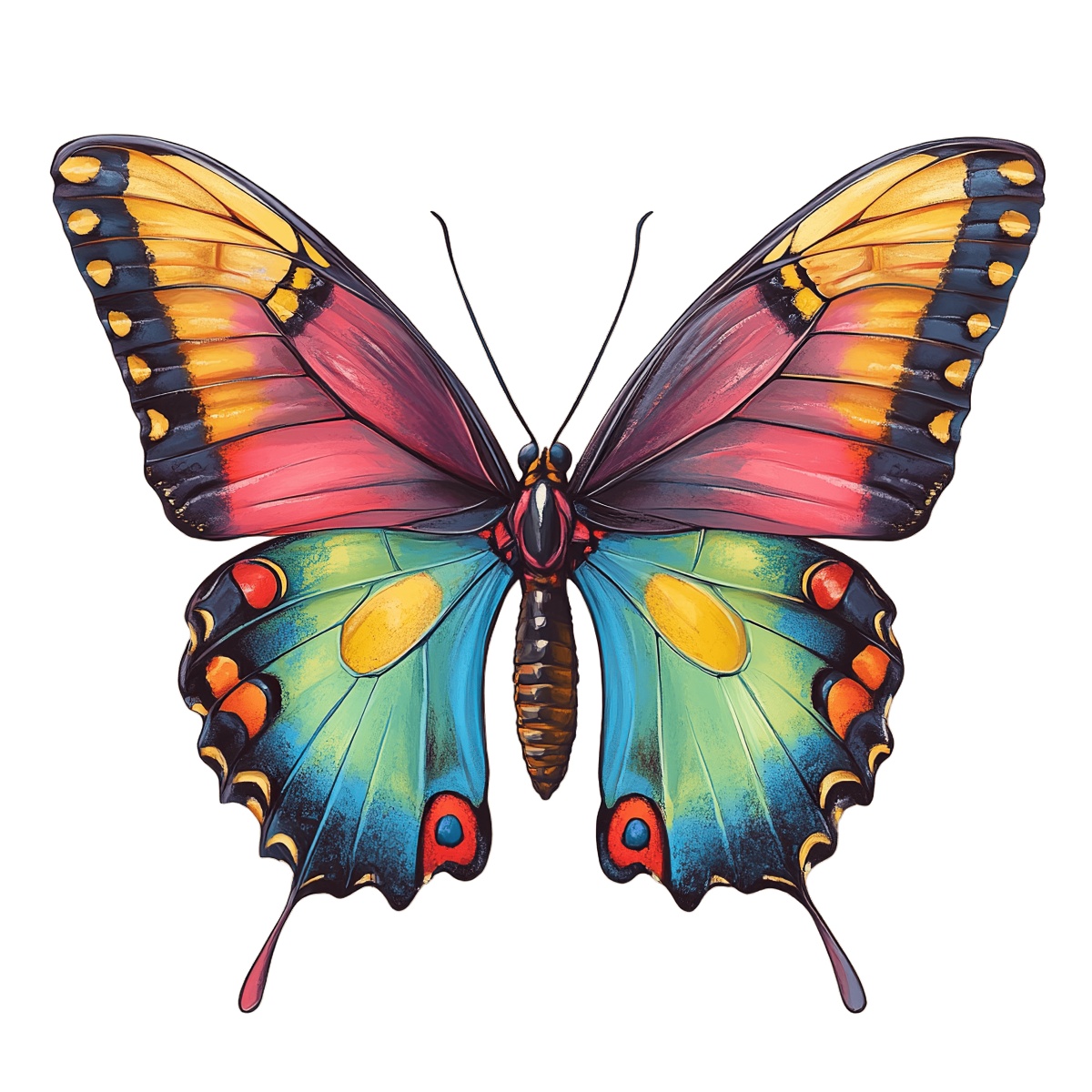 Vividly Illustrated Butterfly With Brightly Colored Intricate Wings Butterfly with multicolored wings featuring intricate patterns and designs.Download PNG ▼Download JPG ▼Related posts:Colorful gecko climbing a textured treeColorful Butterfly With Striking Orange And Purple WingPink Sleigh Loaded with Brightly Colored Wrapped Gift BoxesBlack Cat Wearing Red Cape with Large EyesWatercolor Broccoli Clipart with Green Florets and StemsRed Poinsettia and Leaves in Elegant Floral ArrangementDetailed Illustration Of A Vibrant Red And BlackWatercolor art of Sliced Kiwano Fruit with SeedsStack of Colorful Books with Polka Dot CoversTurtle wearing a red and green festive hatBlueberry Cheesecake Slice on White Plate with ForkBright Sun and Daisy Flowers with Lush Green Leaves