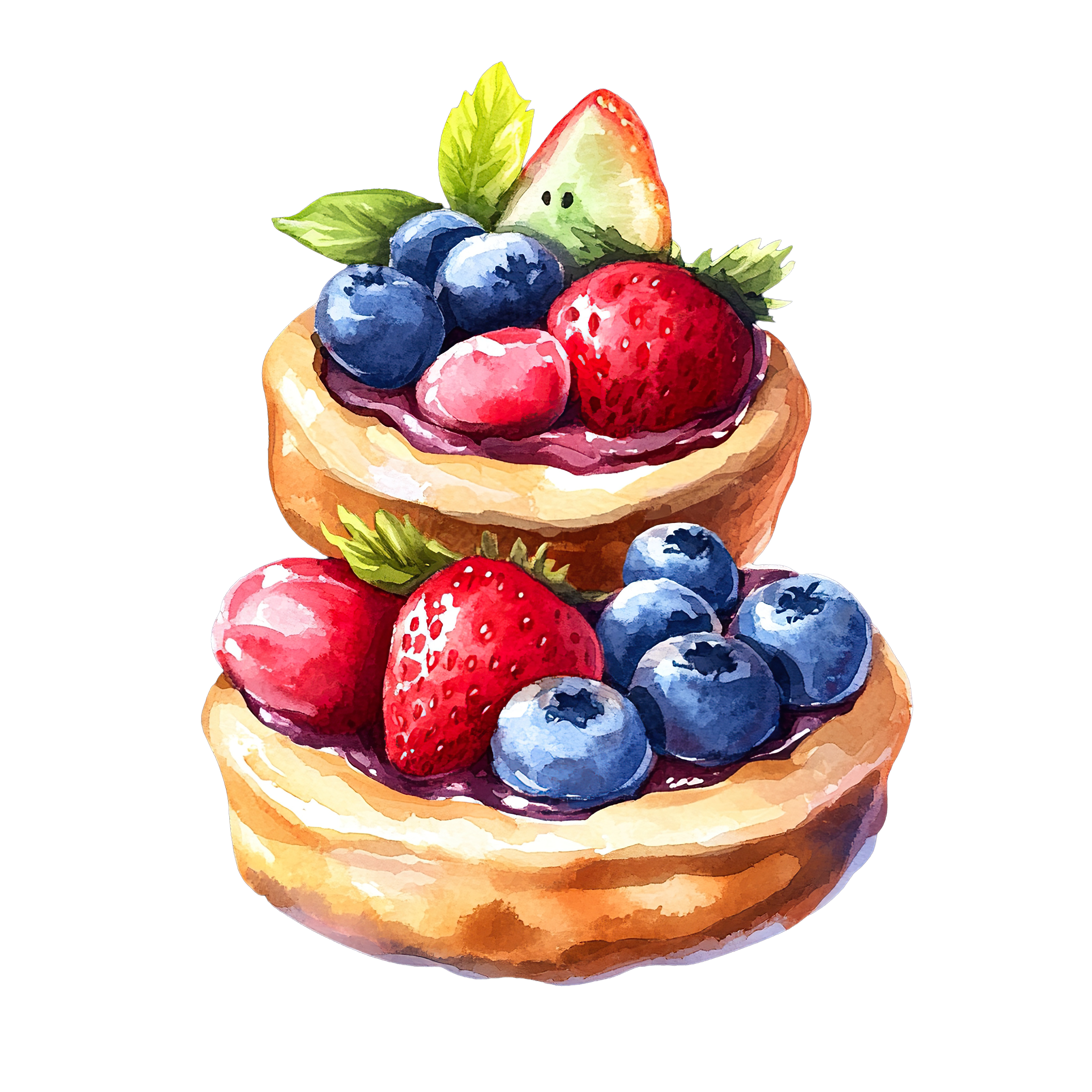 Watercolor Fruit Tarts with Berries and Mint Leaves Fruit tarts topped with strawberries, blueberries, and mint leavesDownload PNG ▼Download JPG ▼Related posts:Orange Peony Flowers With Green Leaves on a Black CanvasSliced Kiwi Fruit with Detailed Texture and SeedsBrown and White Owl Clipart IllustrationVibrant Blue And Green Butterfly With Yellow AccentsGuinea Pig Sitting in a Pet Dish ClipartWatercolor Onion with Orange and Yellow Hues vegetable food clipart vector artGreen Holly Leaves with Bright Red Berries on Black BackgroundHand-Painted Sun with Wavy Rays on Black BackgroundYellow Starfruit Cluster with Green Leaves fruit clipart vector art tropical carambolaColorful skunk clipart with a party blowerWhite Bunny with Purple Bow Tie ClipartOrange And Pink Butterfly With Detailed Wing Patterns