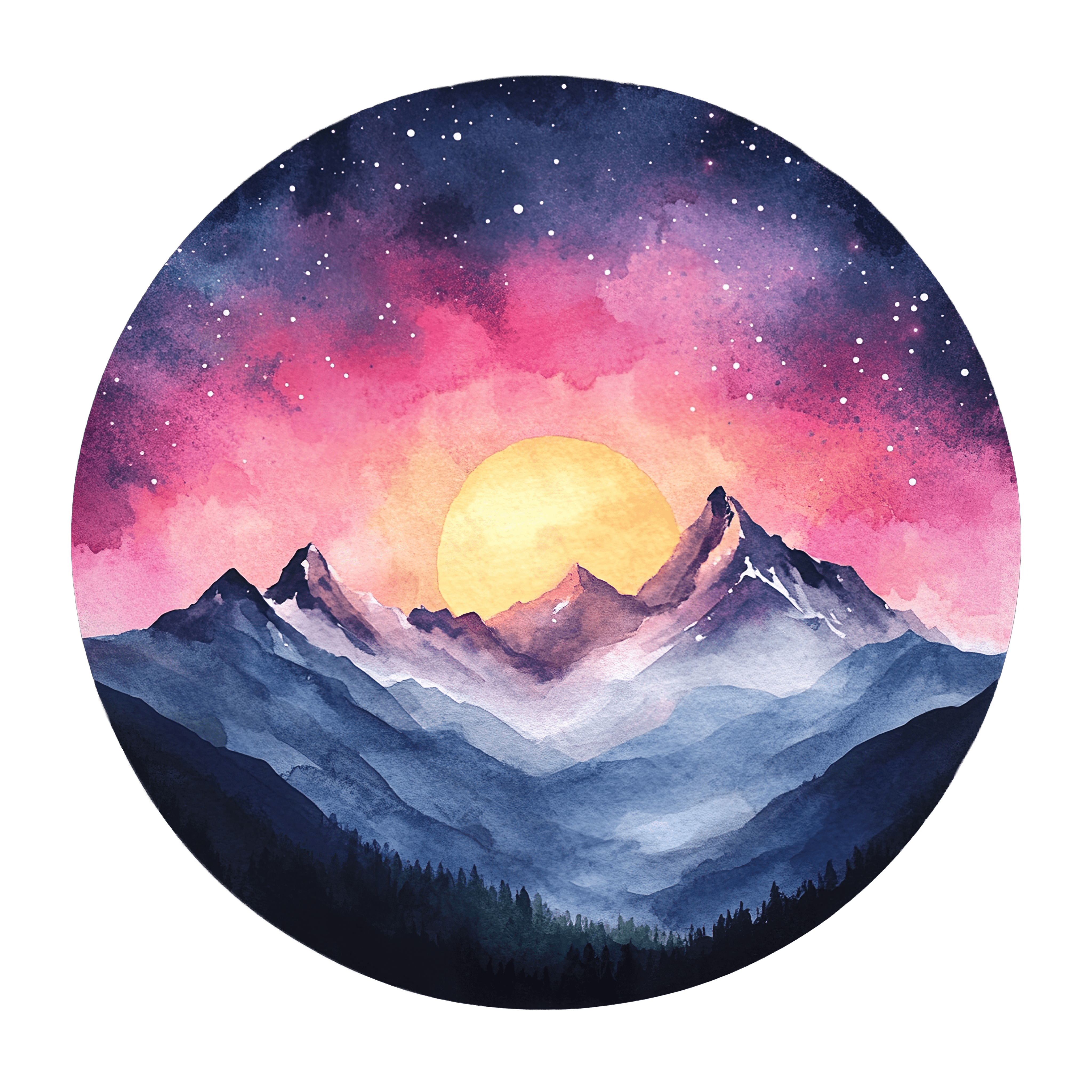 Watercolor Landscape with Mountains and Night Sky in Circular Frame Watercolor mountain landscape with starry night sky and vibrant sunset.Download PNG ▼Download JPG ▼Related posts:Vibrant Butterfly Showcasing Radiant Multicolored WingsOwl Perched in Festive Wreath with Red Berries and LeavesDecorated Christmas Tree with Wrapped Gifts in Festive ColorsThree Festive Christmas Stockings with Red Bows and DecorationsGreen Teacup with Herbal Tea and Leaves beverage drink clipart vector artGolden Brown Croissant Ring with Glossy Finish pastry bread shiny baked foodVibrant Butterfly With Yellow And Green Patterned WingsDetailed Illustration of a Large Pink Dahlia Floral BloomGlass Dessert Bowl with Berries and Cream LayersCartoon Cowboy Character with Hat and Boots in Vector StyleCapybara with Pumpkin on Head Clipart IllustrationVibrant Butterfly Art With Intricate Wing Patterns And