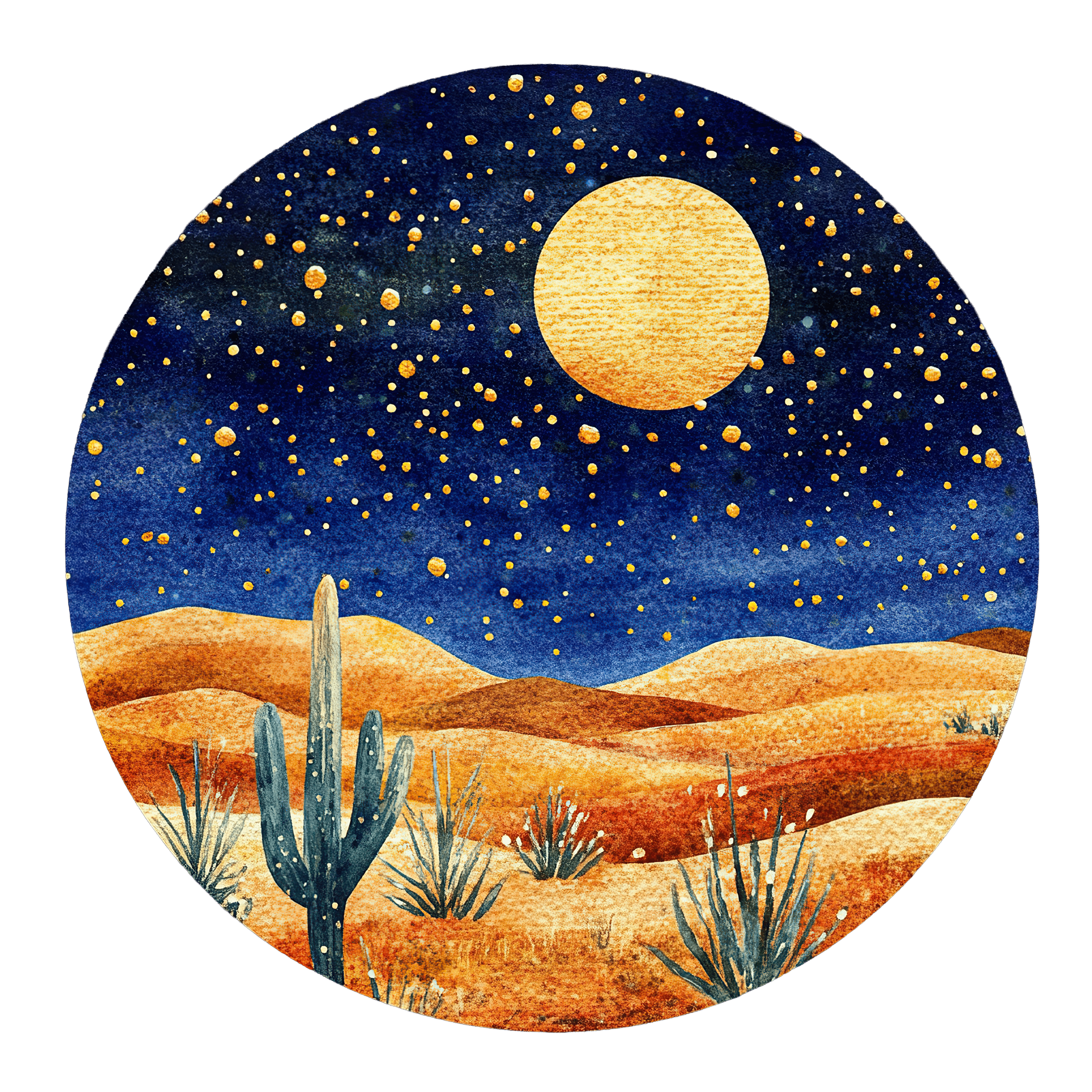 Watercolor Night Desert Scene with Cacti and Starry Sky Watercolor illustration of a desert landscape, featuring cacti and a starry night sky.Download PNG ▼Download JPG ▼Related posts:Watercolor Style Depiction of Orange Slices with Green LeavesCartoon Superhero Character with Red Cape and Blue ArmorChocolate Chip Cookie with Crispy Texture and Rich FlavorFestive Red and White Ornament with Intricate DesignWhole Coconut with Glass of Coconut Milk and PiecesWatercolor Style Red Mango with Green LeafWhole and Halved Green Pomelo with Leaves ClipartChocolate Glazed Éclair with Cream Filling Clipart pastry dessert food vector artPeach Tart with Sliced Peaches and Mint LeavesBunch of Fresh Swiss Chard with Green LeavesGreen Octopus Tentacle Clipart with Detailed TextureWatercolor Slice of Carrot Cake with Cream Topping
