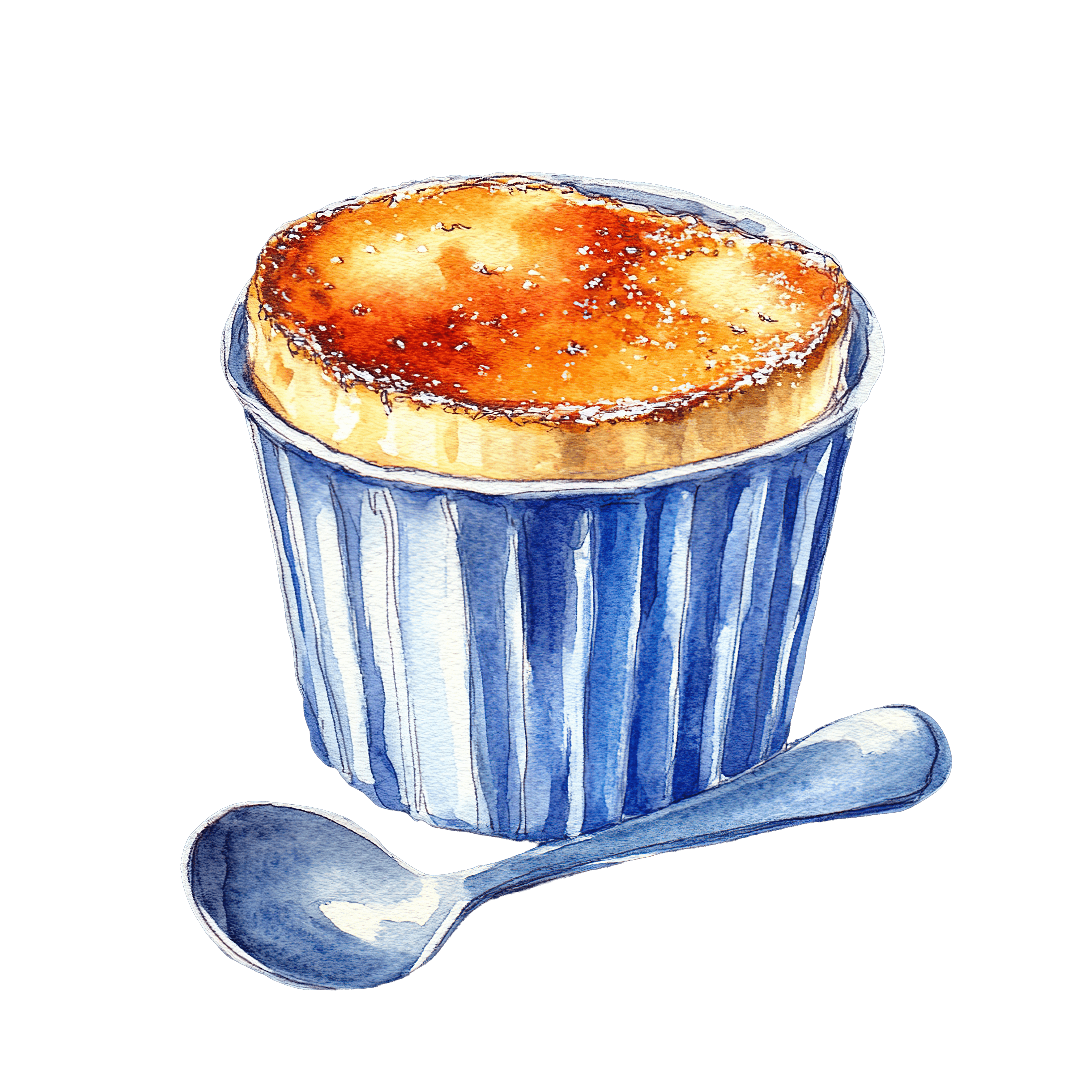 Watercolor Soufflé in Blue Ramekin with Spoon dessert food clipart vector art Soufflé in a blue ramekin accompanied by a silver spoon.Download PNG ▼Download JPG ▼Related posts:Watercolor Grapefruit Halves and Whole Fruit Composition citrus orange clipart vector artRed Berry Branch with Green Leaves and Water DropletsOrnate Red Christmas Ornament with Gold Details and LoopPurple Shaggy Dog Clipart in Vector ArtTwo Glasses of Iced Tea with Lemon and MintCrocodile Jumping Over Colorful Rocks ClipartSmiling Sun with Gold Rays on Dark Background IllustrationCartoon Cat in Pumpkin HoodieMatcha Bubble Tea with Tapioca Pearls and Mint LeavesCartoon duckling wearing a Santa hatFresh Cauliflower with Green LeavesThree Pieces of Baklava on a Blue Plate