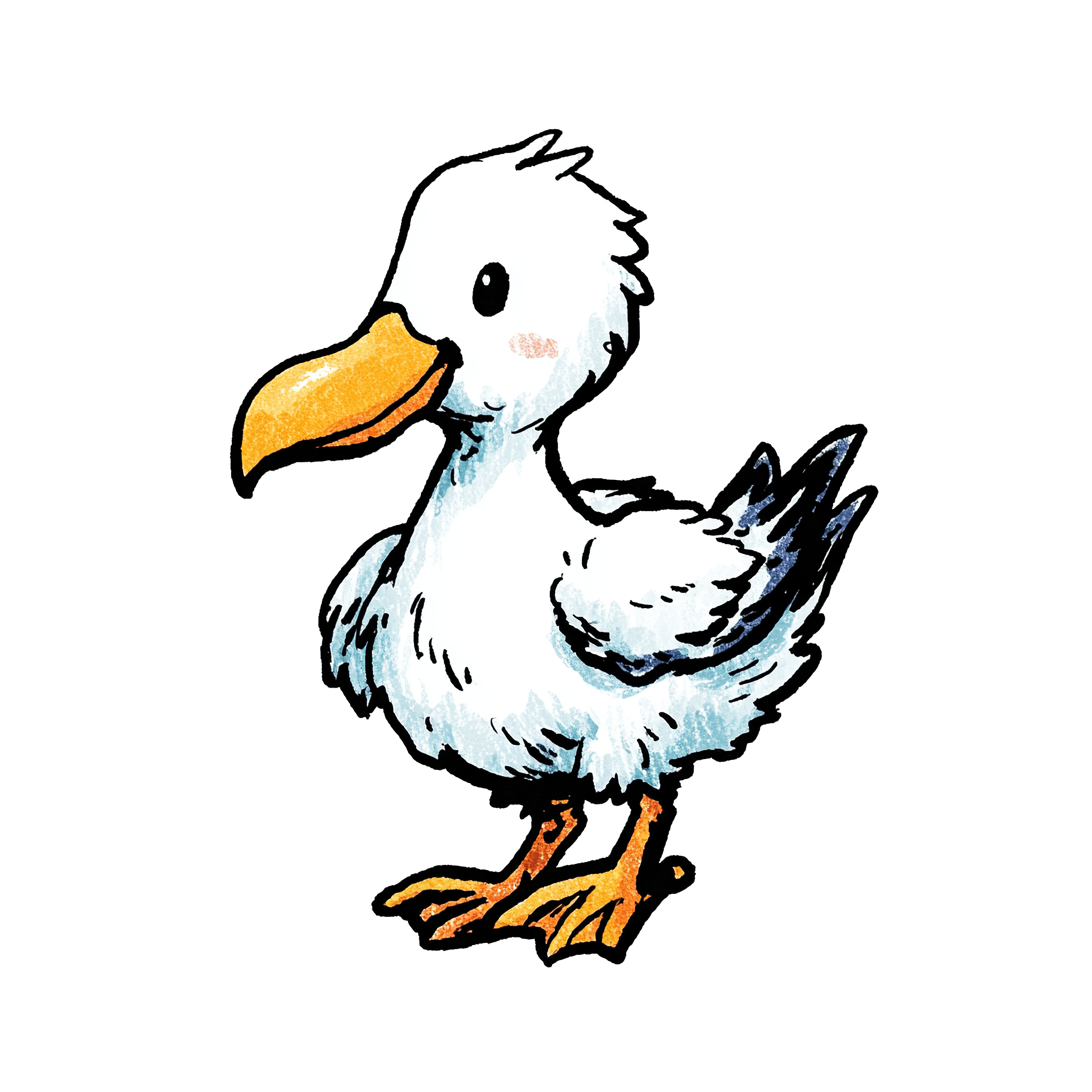 White bird featuring a prominent orange beak and webbed feet. Tail feathers and wing tips are highlighted in dark shades, adding contrast to the fluffy body. The illustration has a cartoon style, perfect for clipart usage.