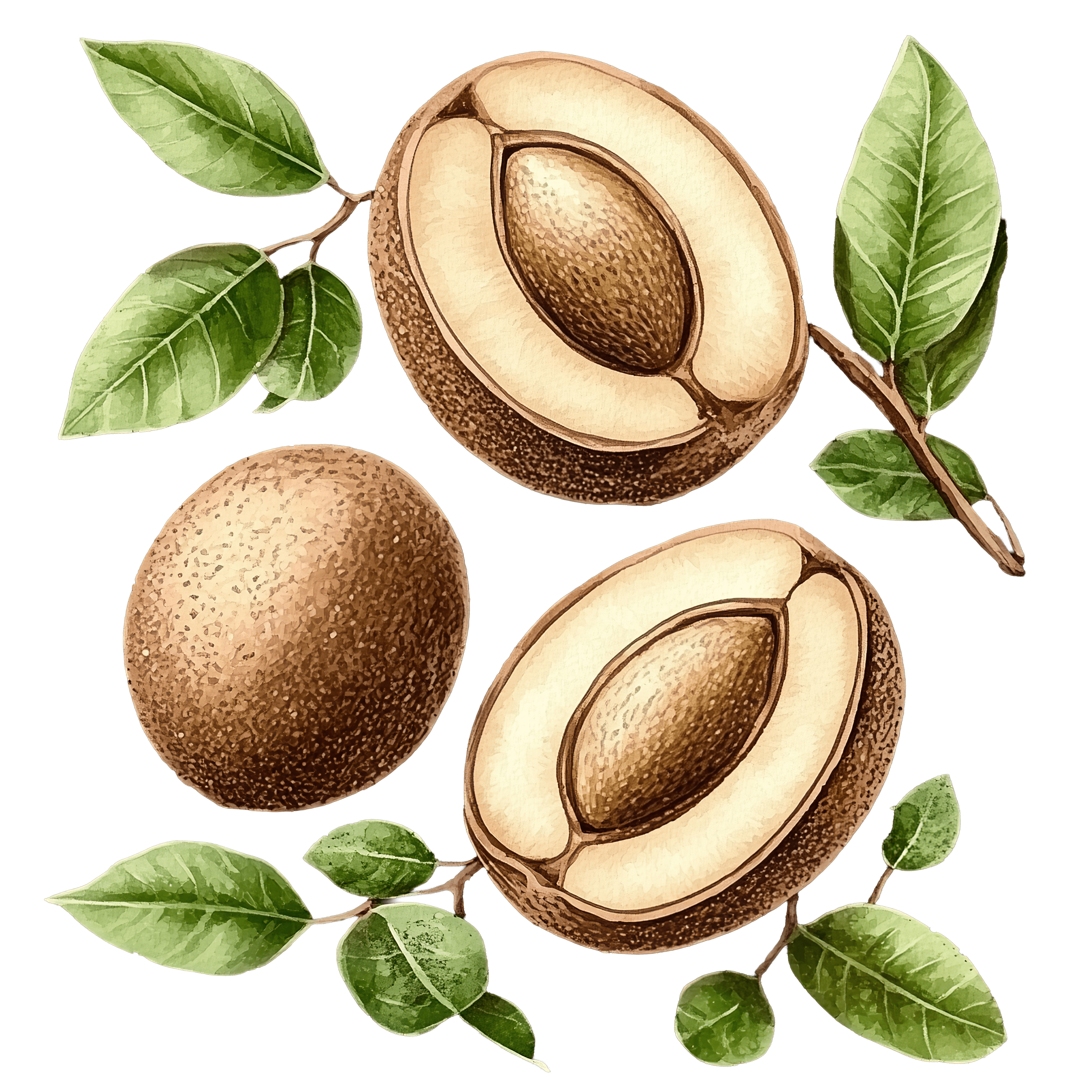 Whole and Halved Sapodilla Fruits with Green Leaves Sapodilla fruits displayed whole and halved alongside green leaves.Download PNG ▼Download JPG ▼Related posts:Detailed Pink Flower Illustration with Layered Petals and Yellow CenterIntricate Red and White Snowflake Gingerbread Cookie DesignDessert Cup with Berries and Whipped Cream ToppingBlue Butterfly With Orange And White Wing AccentsPig in Santa Suit Clipart IllustrationRed Tulip Bouquet with Green Stems and Leaves on BlackWoman in Red Dress Holding a Festive Gift BoxDetailed Butterfly Illustration With Vibrant Yellow And RedWatercolor Opuntia Cactus with Blooming Orange Flowers IllustrationOrnate Decorative Clock with Holly Leaves and Red BerriesColorful Geometric Patterned Bell Pendant on Black BackgroundRed and White Candy Cane with Watercolor Artistic Style