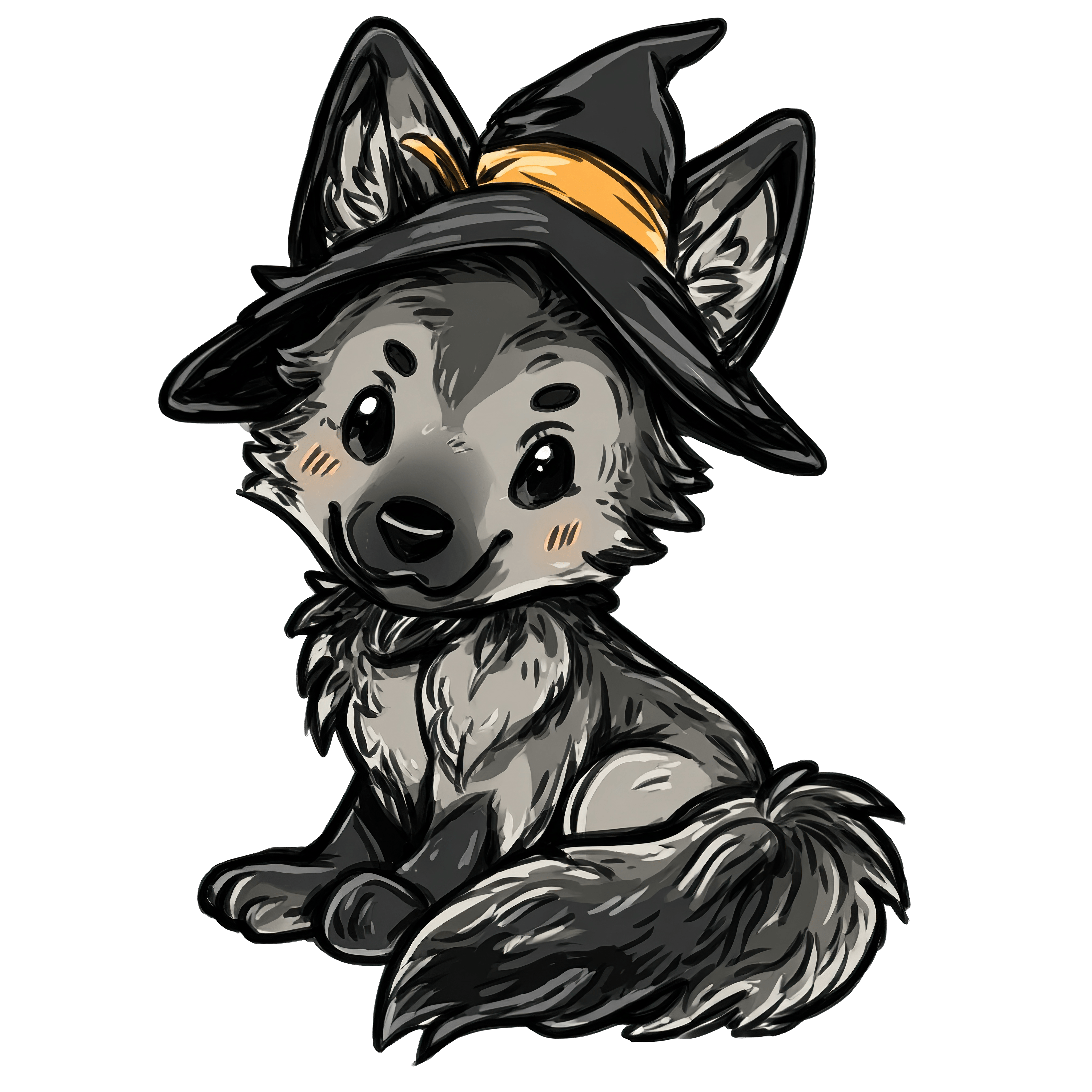 Wolf depicted wearing a witch hat with an orange band, sitting with large furry ears and a detailed bushy tail. The artwork features a mix of gray and black colors, showcasing a textured, hand-drawn style that emphasizes the animal's features and costume.