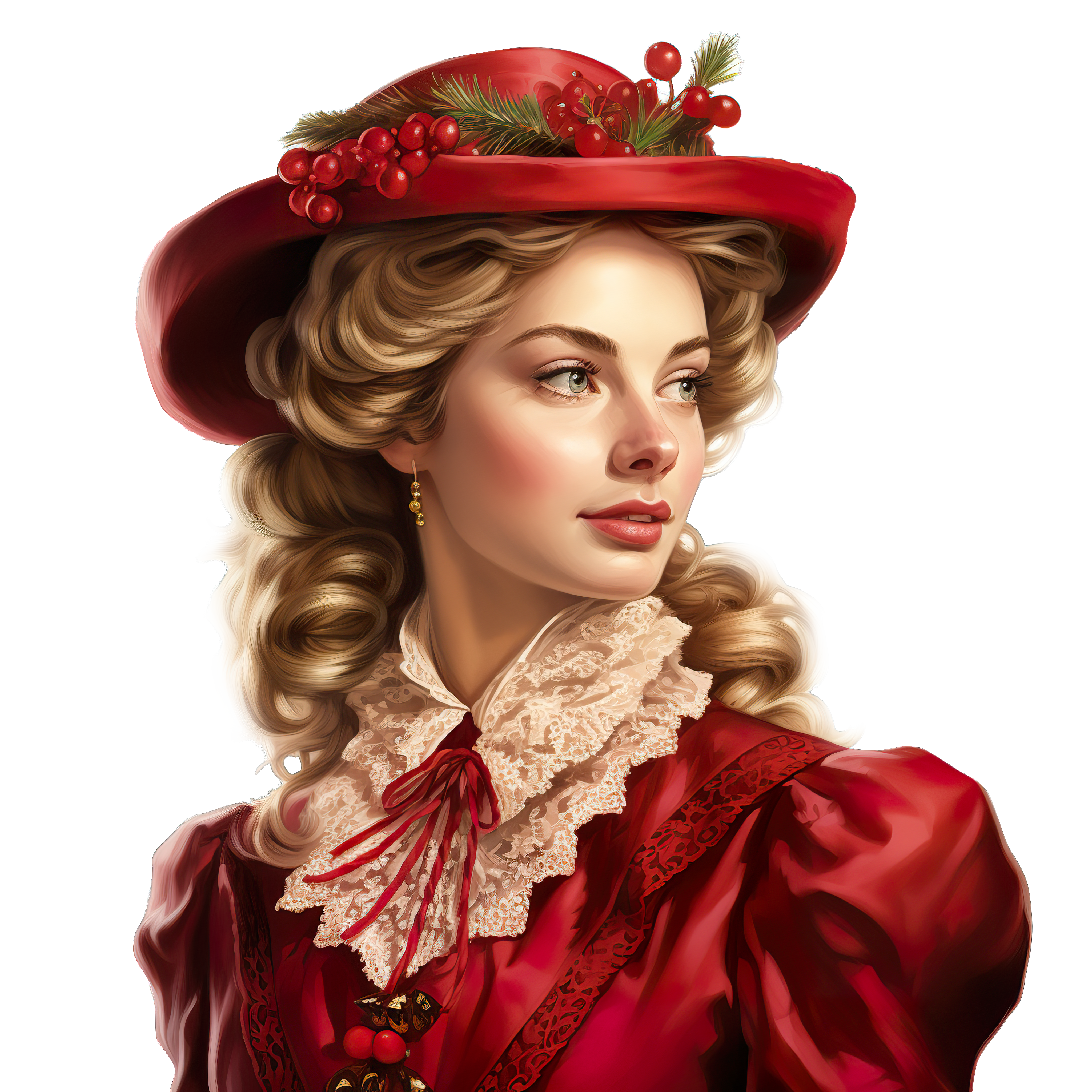 Woman in Red Victorian Outfit with Holiday Hat Woman in a red Victorian outfit with a decorated holiday hat and lace.Download PNG ▼Download JPG ▼Related posts:Christmas Candle with Holly Leaves and Red Berries IllustrationVibrant Galaxy Themed Butterfly With Colorful Wings Galaxy PurpleCartoon duckling wearing a Santa hatWatercolor Pear and Leaves Clipart Green Fruit Vector ArtSloth Hanging on a Branch ClipartDetailed Illustration of a Bright Yellow Sunflower on BlackDecorative Gingerbread Cookie with Intricate Christmas Ornament DesignAlmond Biscotti with Icing and Nut Pieces nuts baked goods food dessertVibrant Butterfly With Yellow And Black Patterned WingsMushroom House with Stone Pathway and Greenery IllustrationSnowman and Evergreen Trees Inside Festive Christmas Snow GlobeSliced Yellow Melon with Visible Seeds fruit juicy clipart vector art printable