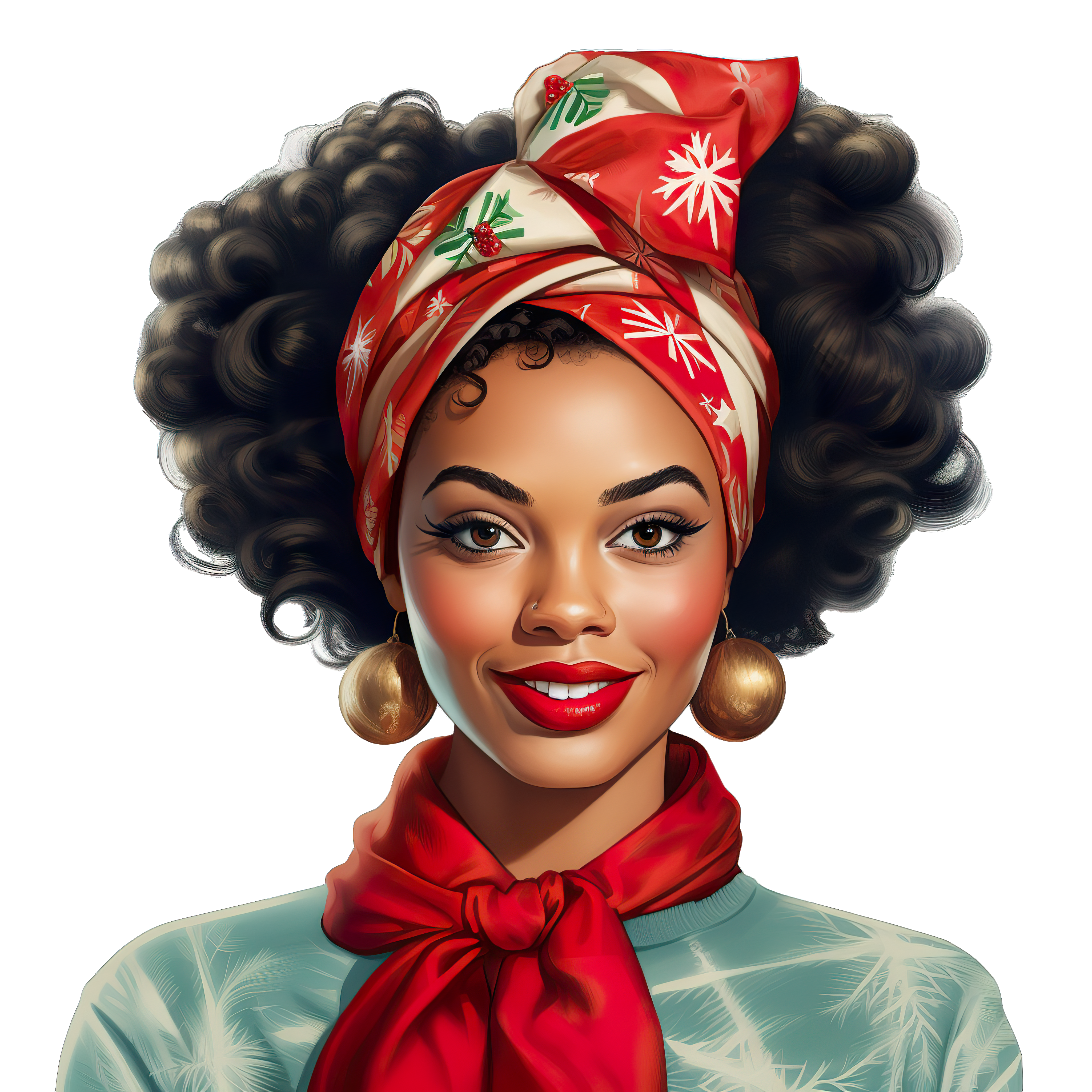 Woman with Festive Headscarf and Earrings in Holiday Theme Woman in a red festive headscarf and gold earrings themed for the holidays.Download PNG ▼Download JPG ▼Related posts:Green Mizuna Sprouts with Detailed Leaves in Clipart StyleRed and White Striped Candy Cane on Black BackgroundWatercolor Coconut Drink with Straw and Orange SliceYellow Chick Splashing in Water ClipartGreen Pea Plant with Leaves and Pods ClipartWatercolor Branch of Red Hawthorn Berries with LeavesHeart-Shaped Palm Leaf Arrangement in Green TonesGingerbread Man Cookie Illustration with Icing DetailsStack of Iced Mince Pies with Sugar Topping on PlateGlass of Purple Juice with Transparent Details beverage drink clipart vector artBlueberry Tart with Fresh Berries and Green LeavesWhite Coffee Cup Filled with Rich Hot Chocolate