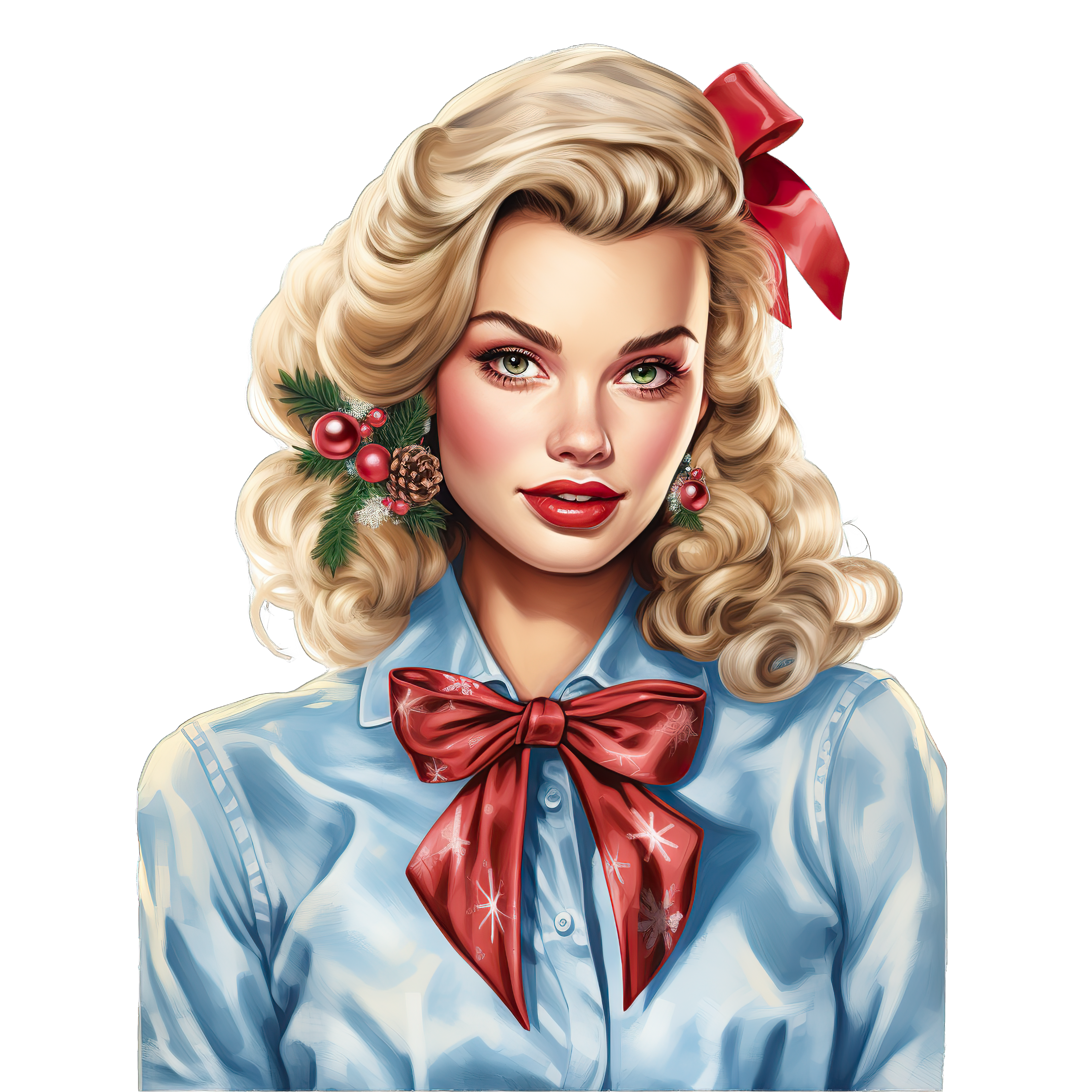 Woman with Festive Red Bow and Christmas Decorations Woman with festive red bow and Christmas decorations in blonde hair.Download PNG ▼Download JPG ▼Related posts:Iced Coffee Glass with Creamy TopSnow Globe Featuring Festive Cabin with Evergreen Trees and SnowfallPurple Butterfly With Detailed Wing Patterns In ClipartBlackberries with Leaves fruit green clipart vector artPenguin wearing a green patterned sweaterWoman in Santa Hat with Snowflakes and Red Dress AccentHolly Branch with Red Berries on Transparent BackgroundTwo Yellow Ducklings Wearing Red Santa Hats for ChristmasVibrant Orange Butterfly With Detailed Wing Patterns BlackTropical Pineapple and Coconut with Fresh SlicesDuck in Bat Cape and Bow Tie ClipartGingerbread Man Cookie with White Icing and Bow Tie Illustration