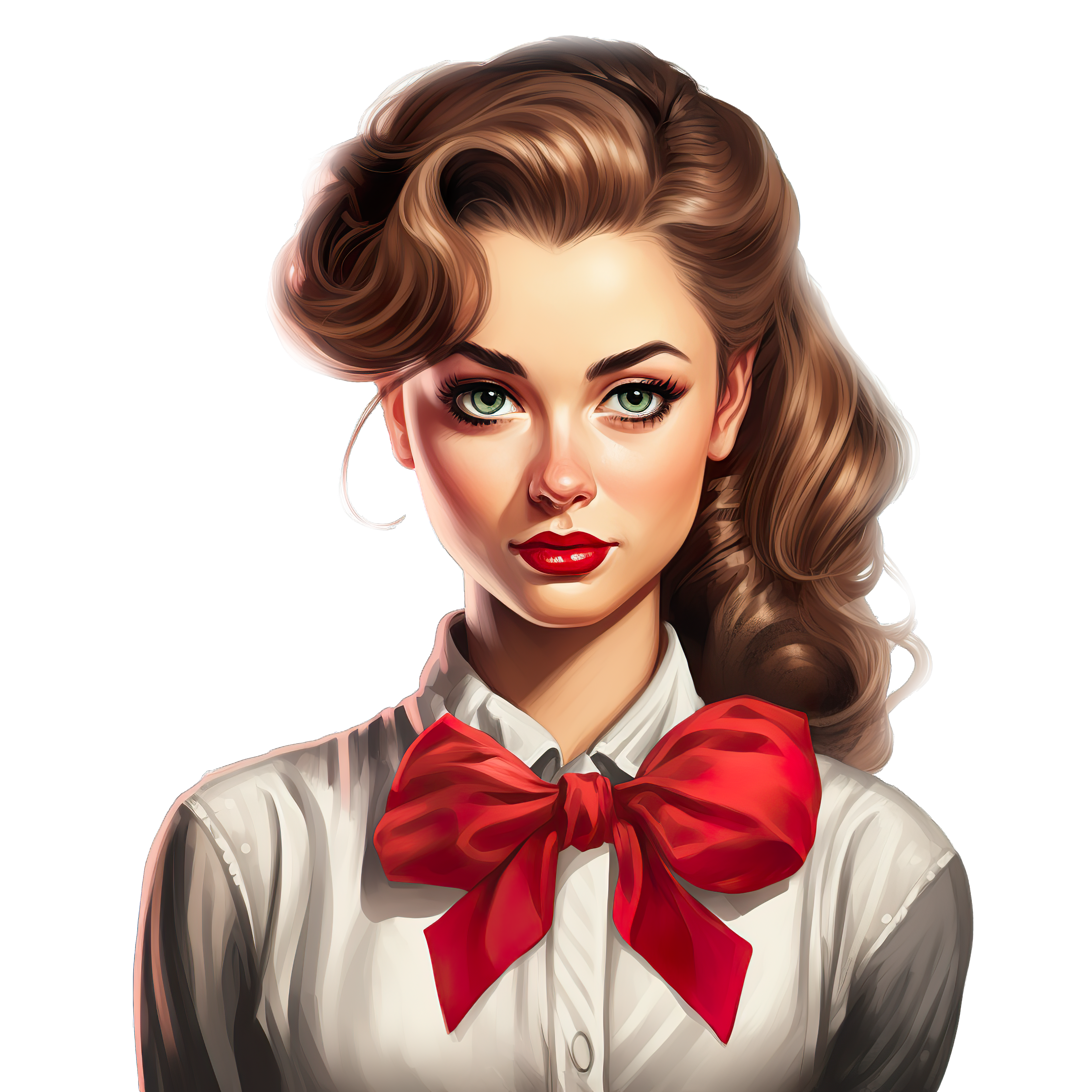 Woman with Red Bow and Vintage Hairstyle Illustration Woman with vintage hairstyle and large red bow wearing a white shirt.Download PNG ▼Download JPG ▼Related posts:Woman Holding Gift Box with Ribbon in Retro Style IllustrationSnow-covered Cottage with Festive Decorations and Red BowsOtter with Antlers Clipart CartoonTwo ripe oranges hanging from a leafy branchWatercolor Soufflé in Blue Ramekin with Spoon dessert food clipart vector artStack of Colorful Books with Teacup on Top IllustrationOpen Book with Colorful Rainbow and Clouds AboveCartoon Martial Artist Character in Black Uniform and HeadbandOpen Book with Crescent Moon Above on a Dark BackgroundDetailed Butterfly Illustration With Yellow And Black WingsBright Yellow Daisies with Green Leaves on Black BackgroundBlueberry Muffins with Fresh Leaves on Top food drink dessert watercolor clipart