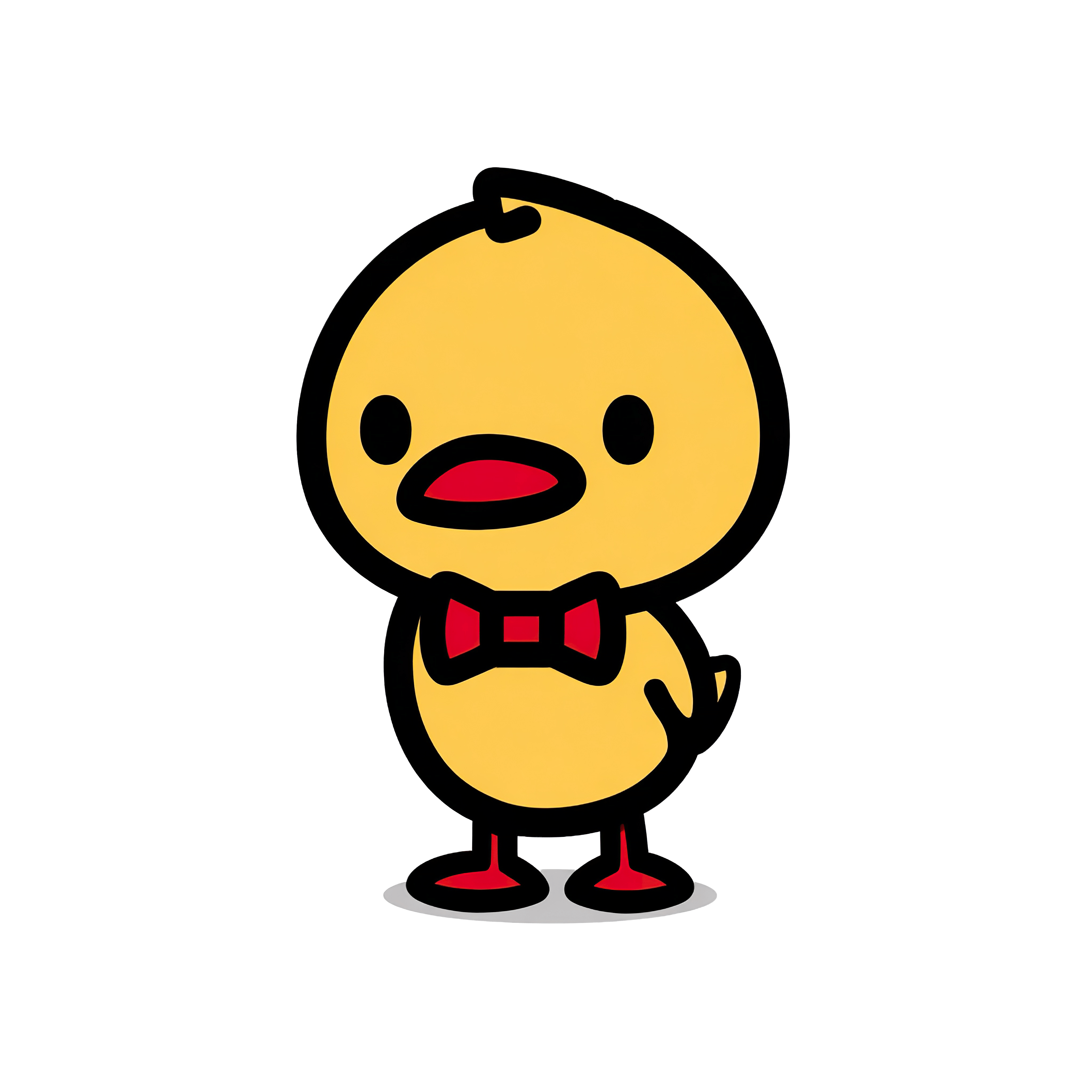 A cartoon illustration of a yellow chick wearing a red bow tie and red shoes. The chick stands upright and is outlined in black, featuring simple shapes and solid colors. This vector art image is suitable for various printable projects, educational materials, and digital content requiring animal graphics. It is designed with a clean and bold outline.